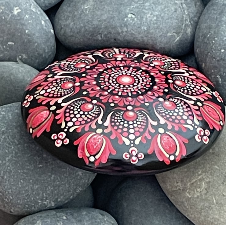 Pink hand painted original and unique dot Mandala art stone - This dot Mandala art stone is a unique and beautifully crafted décor piece, hand cast in the finest quality gypsum, painted with quality artists acrylic paint and protected by a high gloss glaze for added durability. The intricate dot design on the stone creates a beautiful and eye-catching design, making it the perfect gift as a paperweight or decorative item for any indoor space. Ideal for adding a touch of charm to your home or as a thoughtful gift for someone who appreciates hand-crafted items, this one-of-a-kind piece is sure to stand out and make a statement in any room.