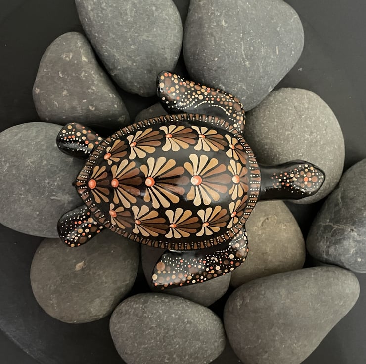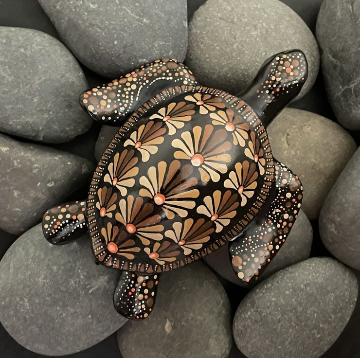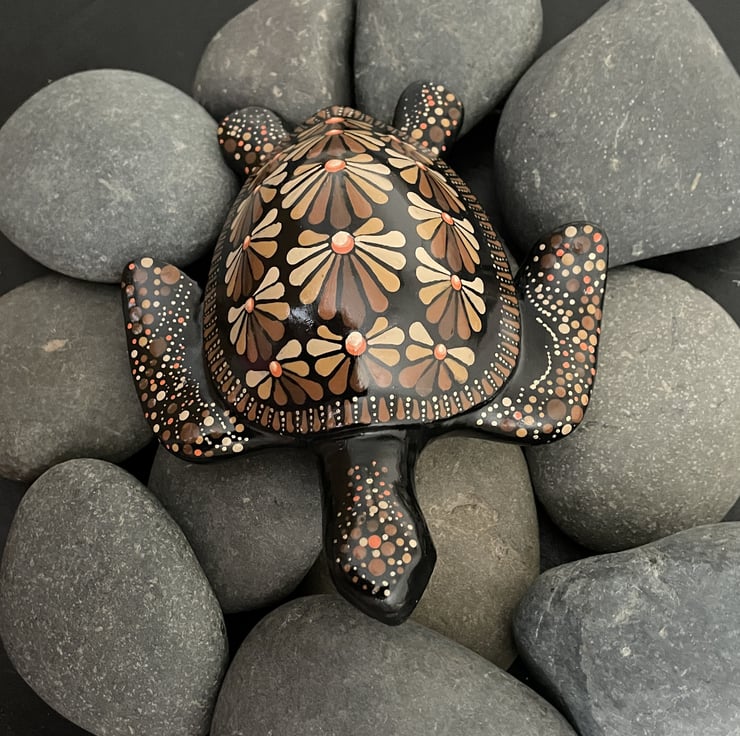 Brown turtle hand painted, original and unique dot Mandala art stone - This dot Mandala art stone is a unique and beautifully crafted décor piece, hand cast in the finest quality gypsum, painted with quality artists acrylic paint and protected by a high gloss glaze for added durability. The intricate dot design on the stone creates a beautiful and eye-catching design, making it the perfect gift as a paperweight or decorative item for any indoor space. Ideal for adding a touch of charm to your home or as a thoughtful gift for someone who appreciates hand-crafted items, this one-of-a-kind piece is sure to stand out and make a statement in any room.
