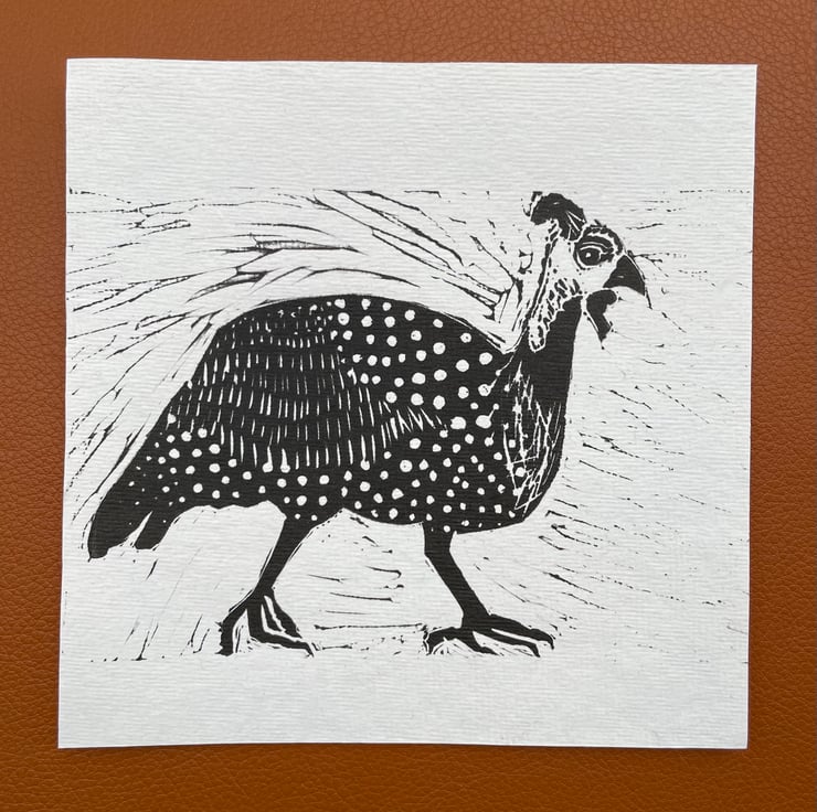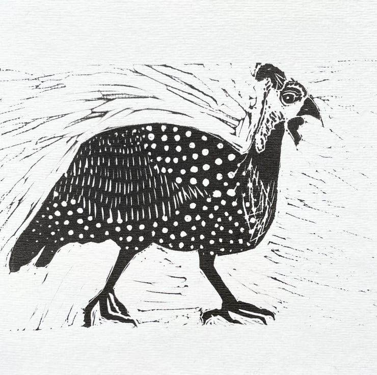 A black linocut print of a dotty Guineafowl bird on a textured off white background.