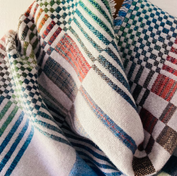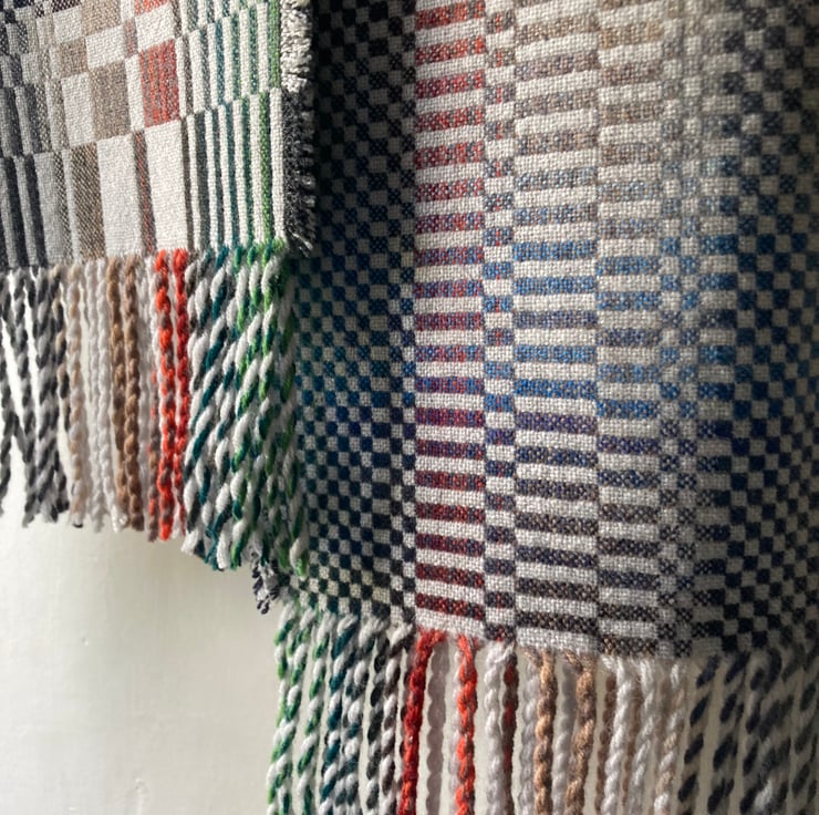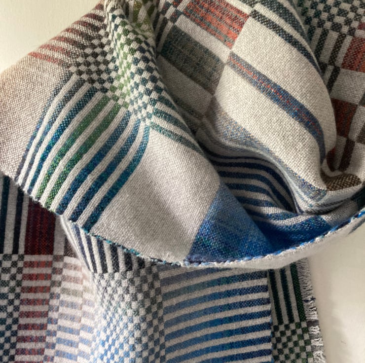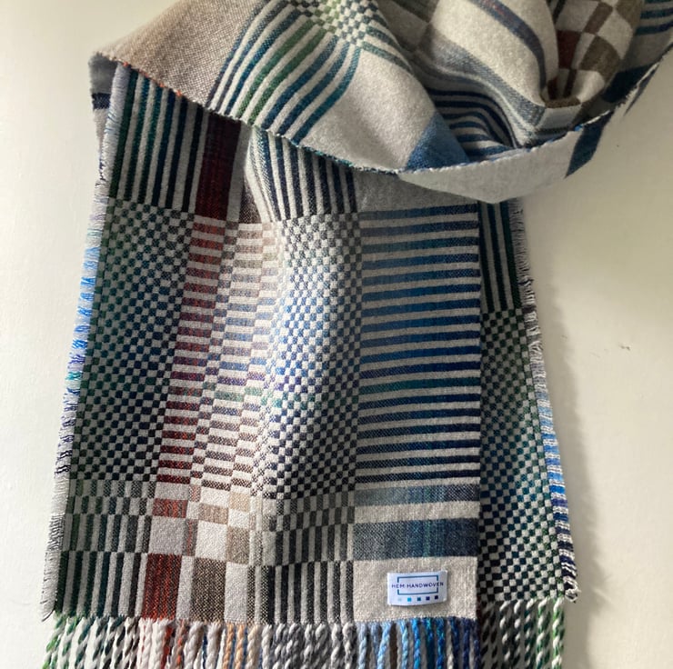 Woven in doubleweave - two layers woven together- in the softest Yorkshire-spun merino lambswool, Quarterdeck is an abstract postcard from Robin Hood’s Bay. An abstracted view from the Quarterdeck, the house with the best sea view, the sea wall, defences and the North Sea beyond. Woven in over 50 shades of yarn, individually placed, the design is double-sided with visual blending and Fibonacci shading, creating maximum visual interest and movement. The nearest this weaver can get to painting, each one took over 10 days to weave. Soft and warm, and plenty long enough for keeping the harshest weather away.