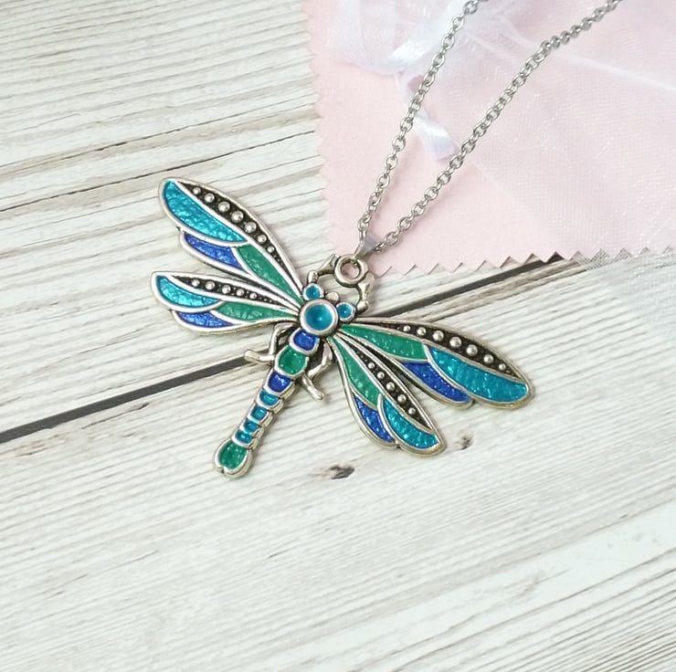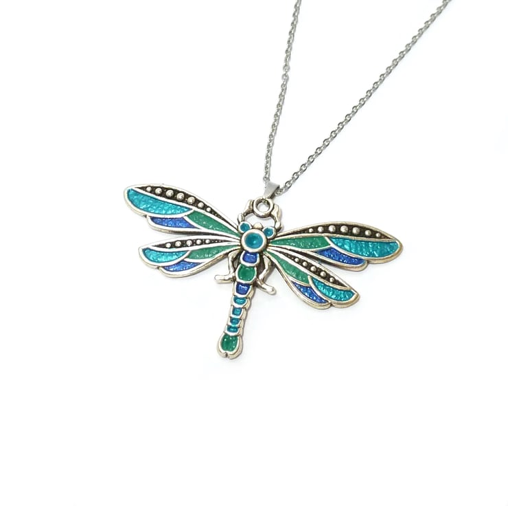 The dragonfly measures 50mm from top to bottom and the wingspan is 72mm. The Stainless Steel ball chain is 69cm - message me if you would prefer a plain chain to a different length.