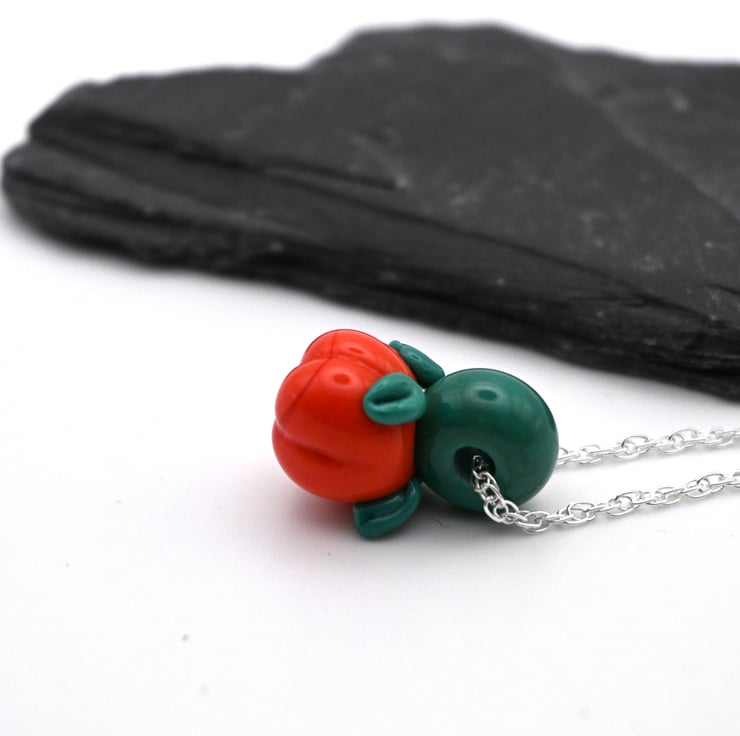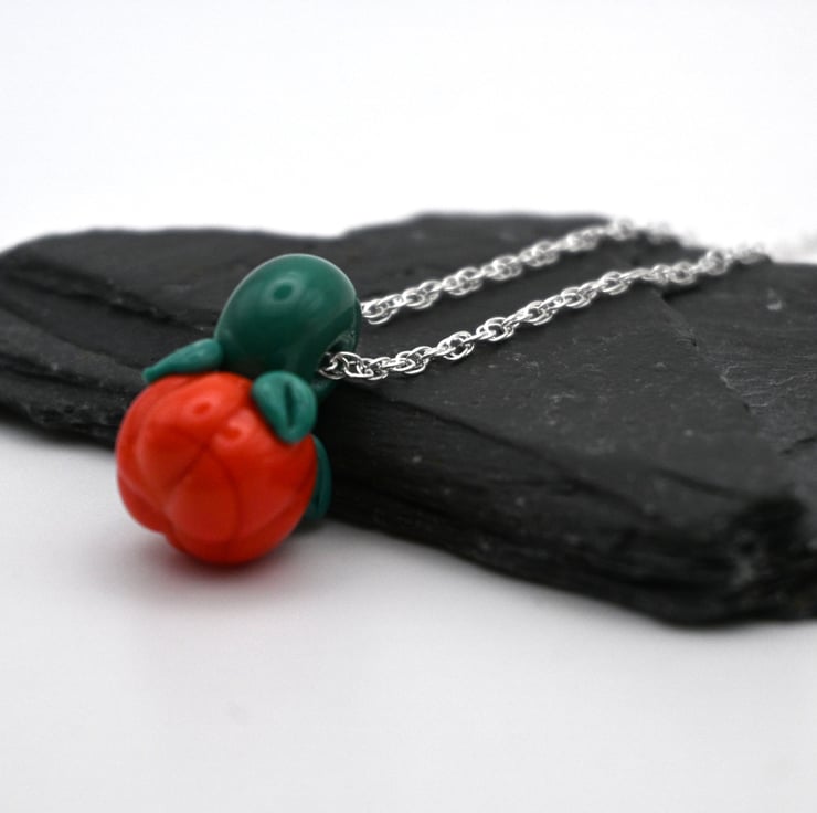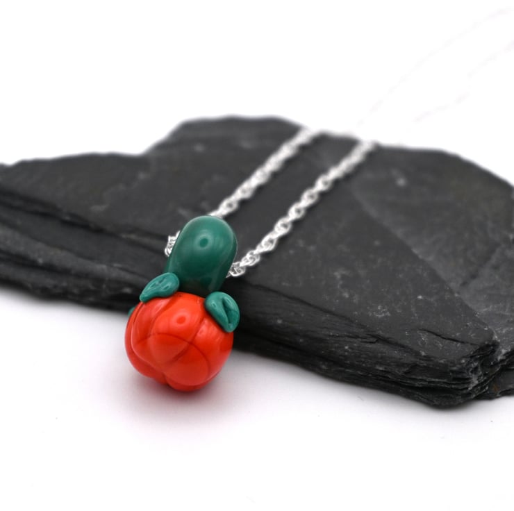 A handmade lampwork glass pumpkin pendant strung onto a sterling silver chain.