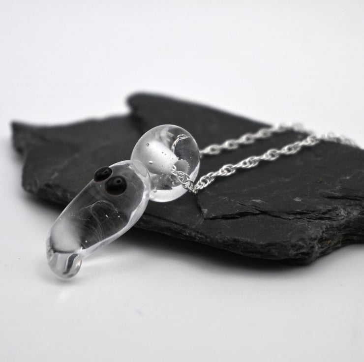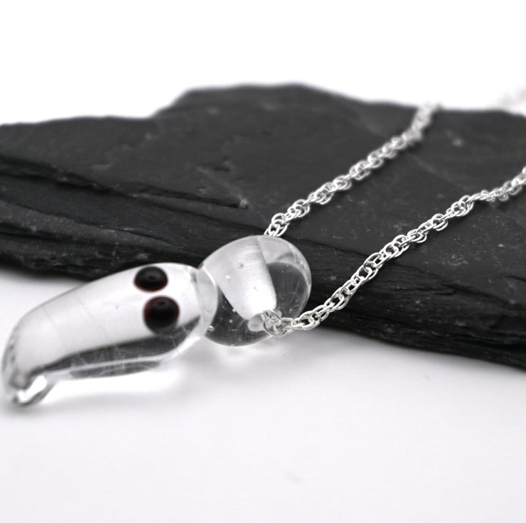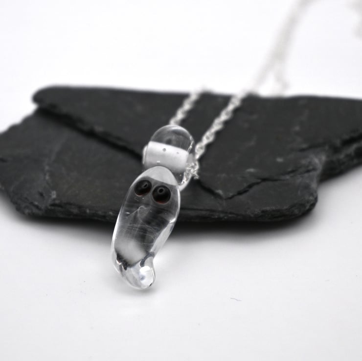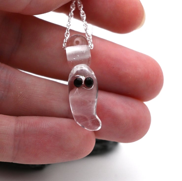 A handmade lampwork glass ghost pendant strung onto a sterling silver chain.