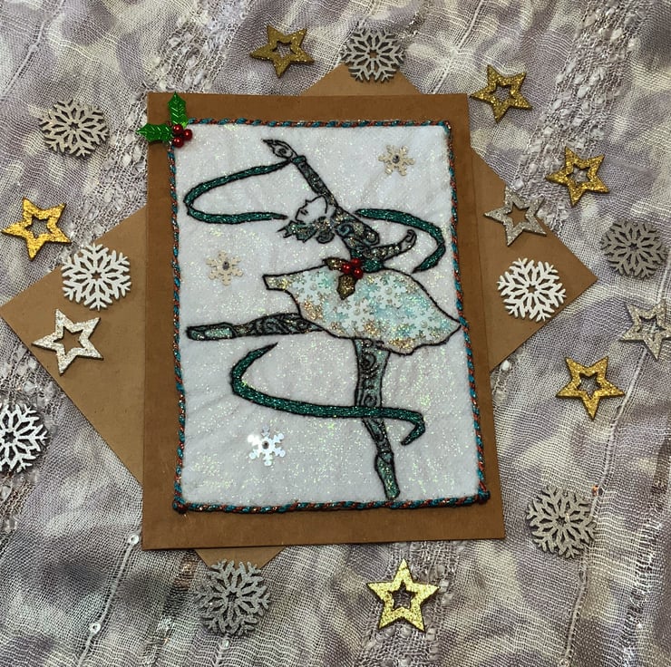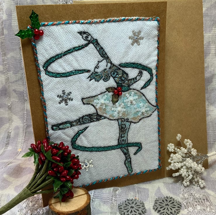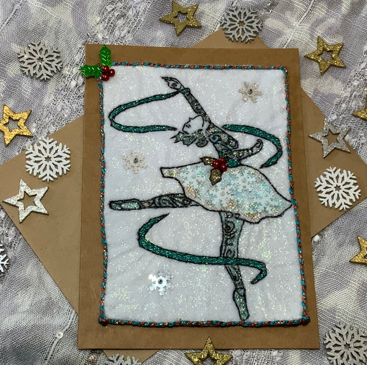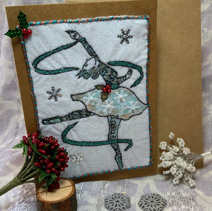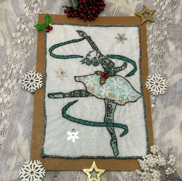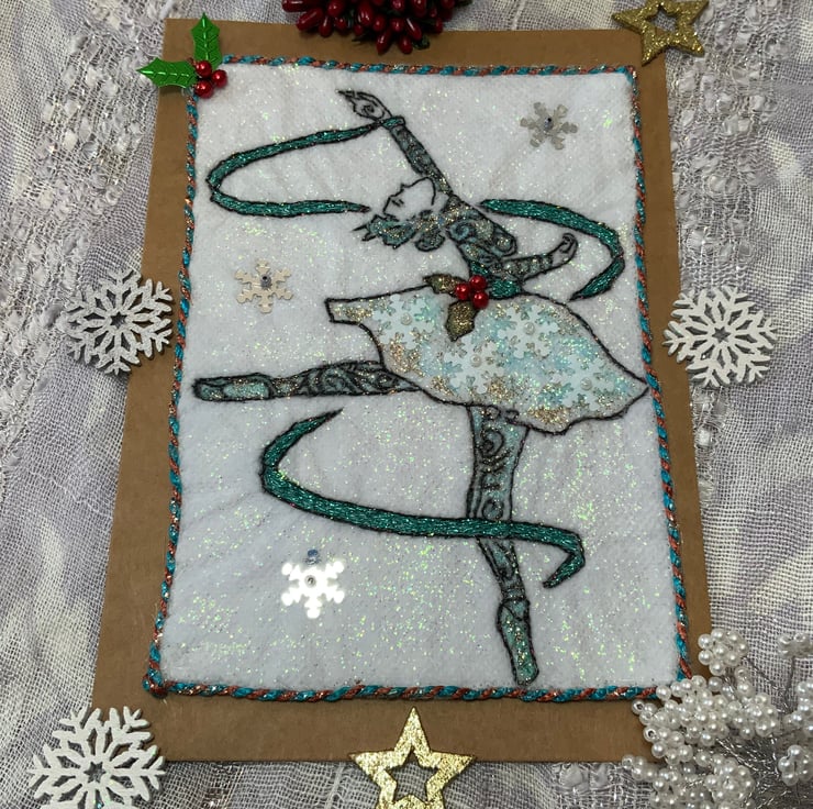 Lovingly hand embroidered and hand painted in watercolour on felt and fine embossed cotton with added sparkle. The ballet dancers dress is adorned with a frosty lace effect, enhanced by blue metalic embroidery thread and added snowflakes. Holly and berries are added to the ballet dancer's dress for the festive season.