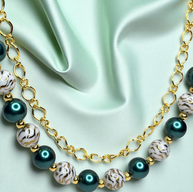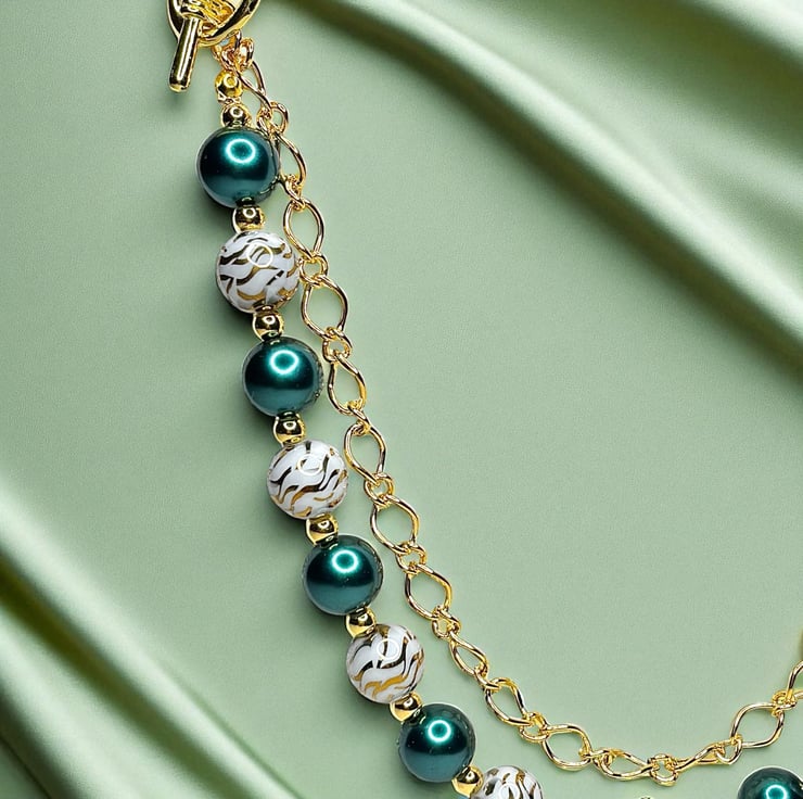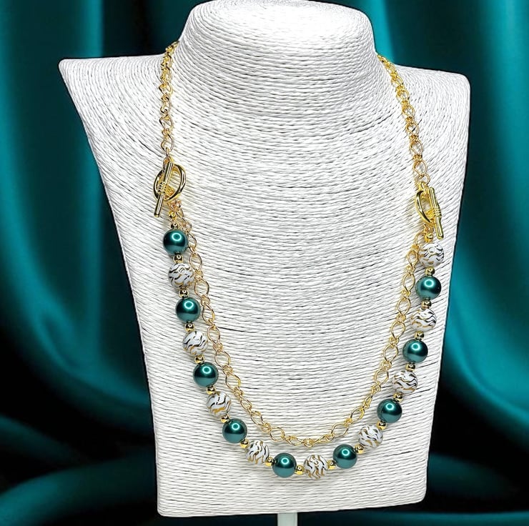 This stunning necklace features a chic combination of 10mm glass pearls in vibrant Jade and elegant white glass beads adorned with a striking gold tiger stripe detail. The gold-plated oval twist stainless steel chain not only adds a touch of luxury but also ensures durability. Designed for effortless elegance, the unique twin toggle clasps not only serve as a chic design element but also make wearing the necklace a breeze—simply open one clasp, drape it around your neck, and you're ready to shine! Measuring approximately 20 inches, this timeless piece will arrive carefully wrapped in tissue and nestled in a lovely organza bag, making it a perfect gift for yourself or a loved one,