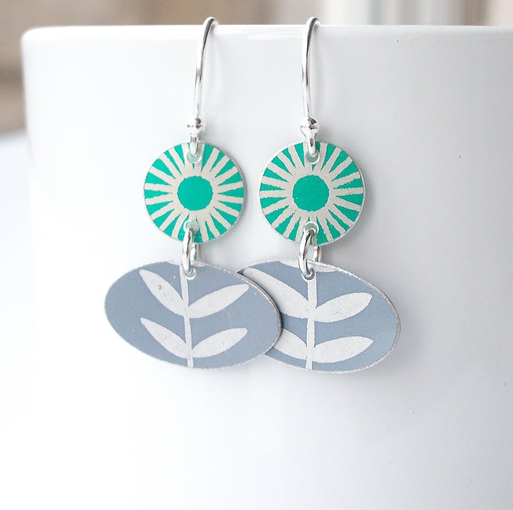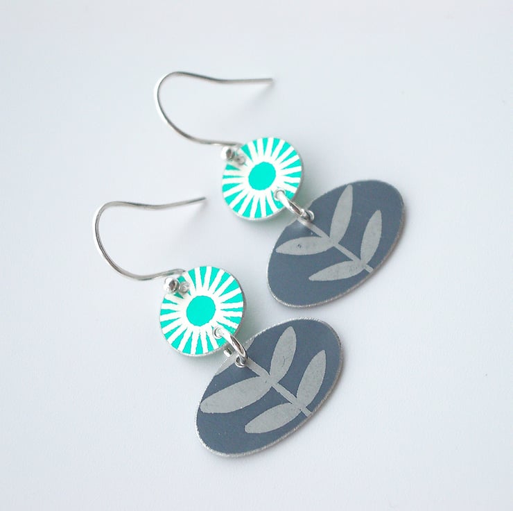 These flower and leaf earrings are inspired by scandi style folk art and are made from anodised aluminium which I have dyed in jade green and grey and printed with a leaf print. The dye is made permanent by heating the aluminium. I have cut out the circle and pod shape with a piercing saw and filed the edges for a nice smooth finish. The two pieces are linked with a sterling silver hoop and dangle from a sterling silver ear wire. The circle and pod shape together both measure approximately 25mm from top to bottom and the widest part of the pod measures 20mm across.