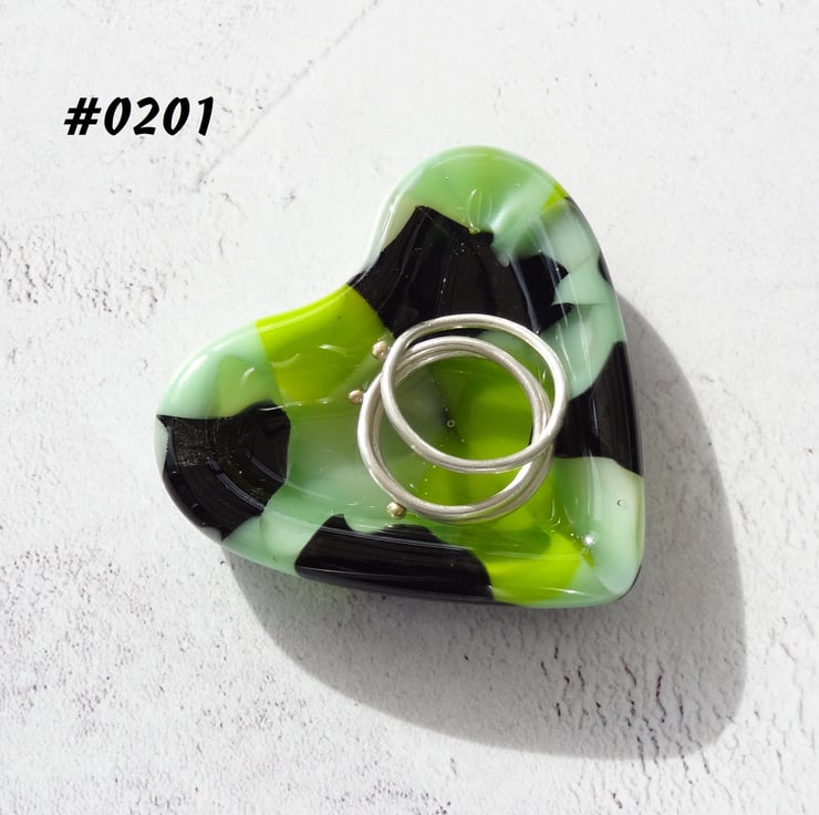 Green & black heart shaped fused glass ring dish, 5cm approx (0201)
