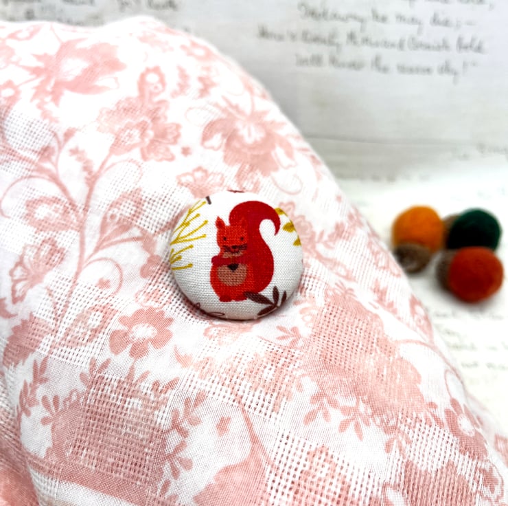 I've designed this charming little squirrel as a 3.8cm fabric button, complete with sweet rosy cheeks and a bushy tail. A touch of polyester toy stuffing adds a lovely dome shape to the button.