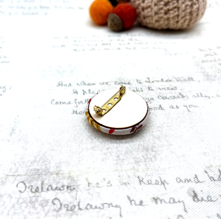 For added durability, I've incorporated an FSC-approved wooden circle disc on the back of the button, allowing for a secure metal brooch back with a safety catch.