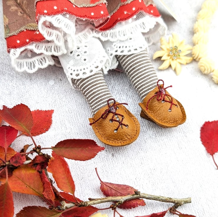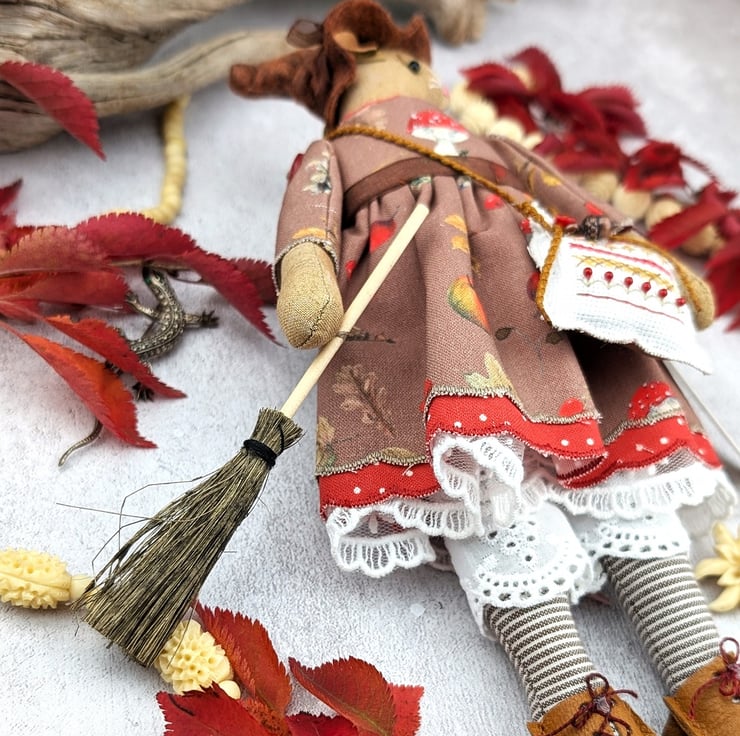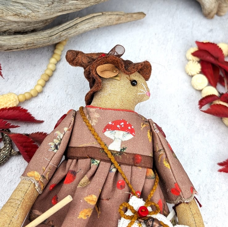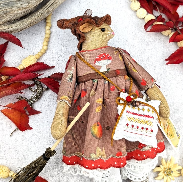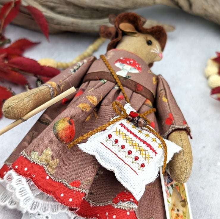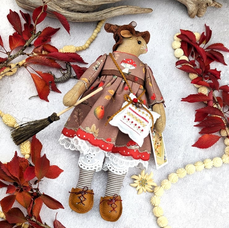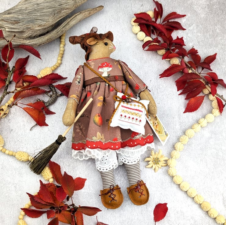 This is Rose HIP, a tiny brown harvest mouse. She is a hand embroidered witch mouse with little leather ears and tail. She is dressed in an Acufactum print called Forest Mushroom. She has coordinating underskirts and cotton lace bloomers. Her dress is finished with organza ribbon, tiny buttons and little leather shoes, she sports a tiny witch's hat with a button and carries a tiny broom.