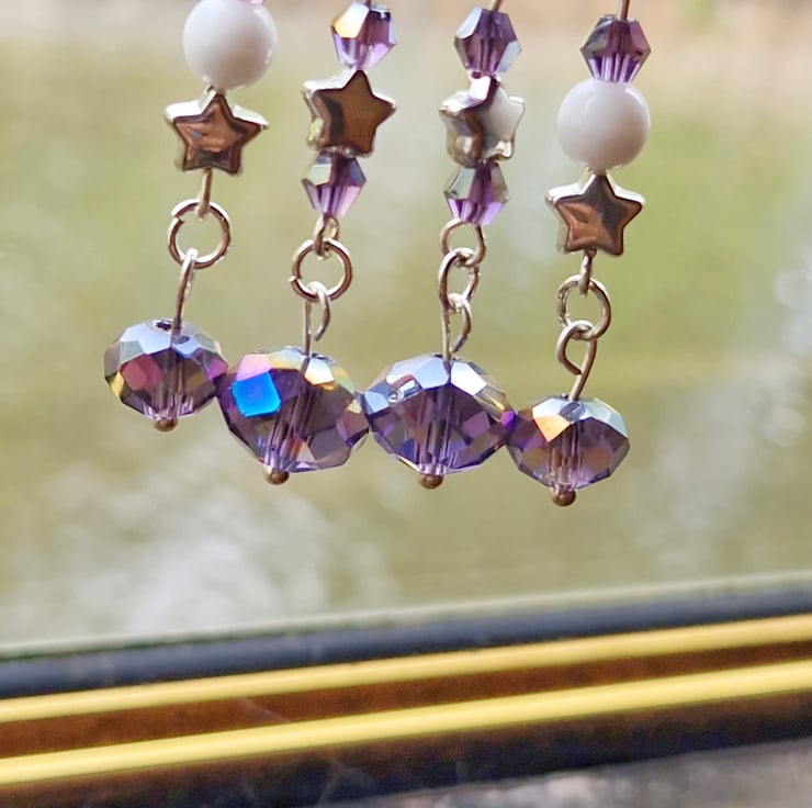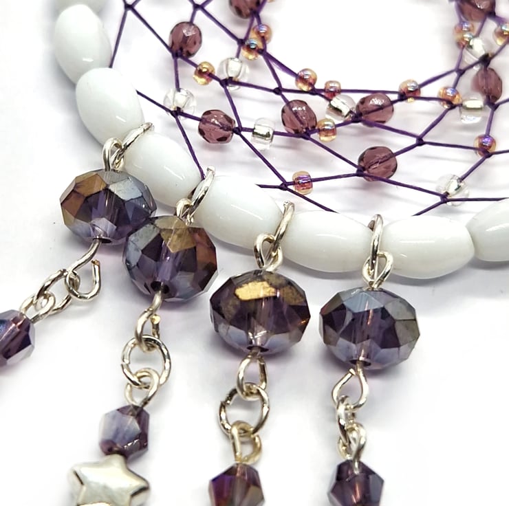 The hoop is memory wire threaded with white block oval beads, and hung with silver stars, white round beads and and purple glittering beads