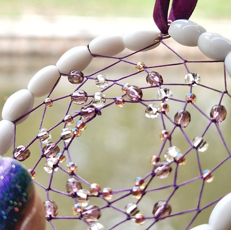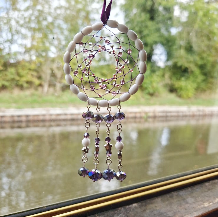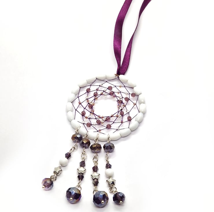 This purple silver and white beaded dreamcatcher has been carefully and lovingly created to bring some joy and mindfulness to your little world.