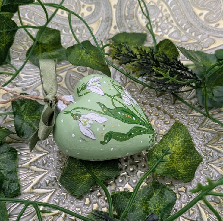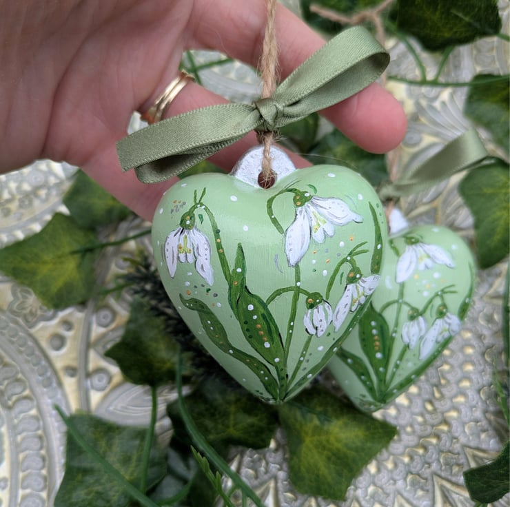The ceramic heart bauble is 6 x 6.8 x 4cm and is lovingly painted by hand in acrylic paint and gloss varnished. The Snowdrop design is painted on the front and back of the bauble.