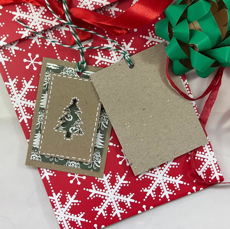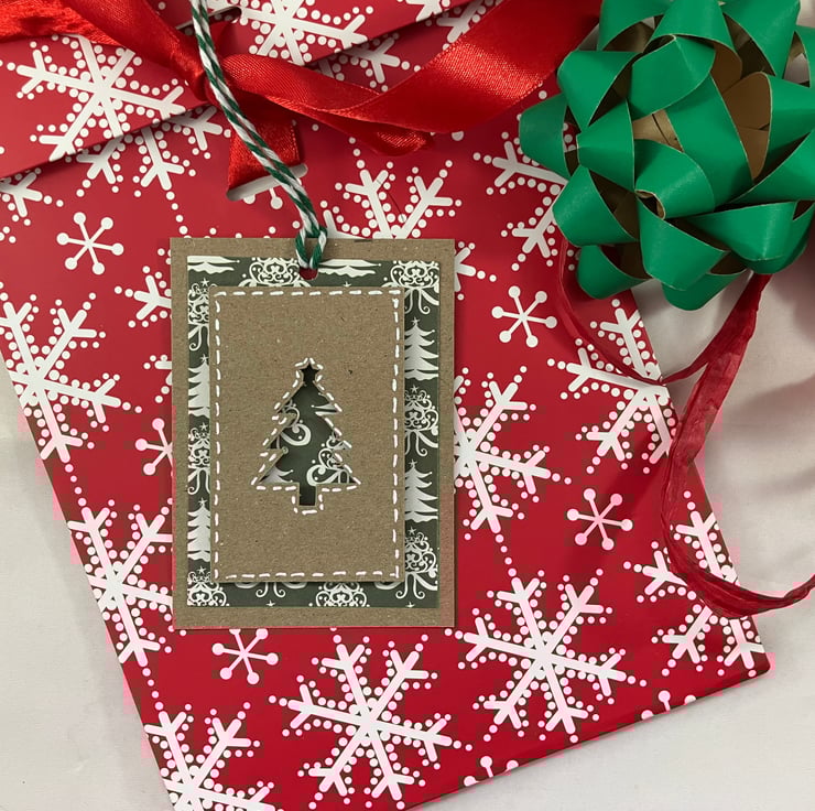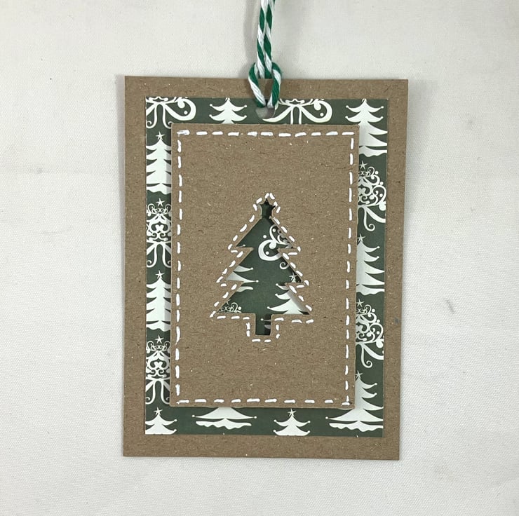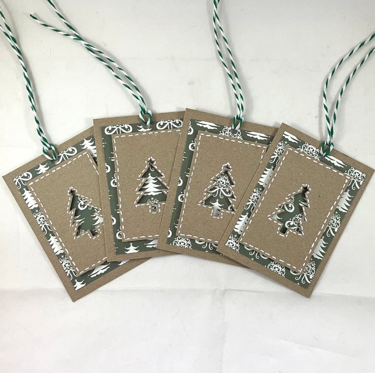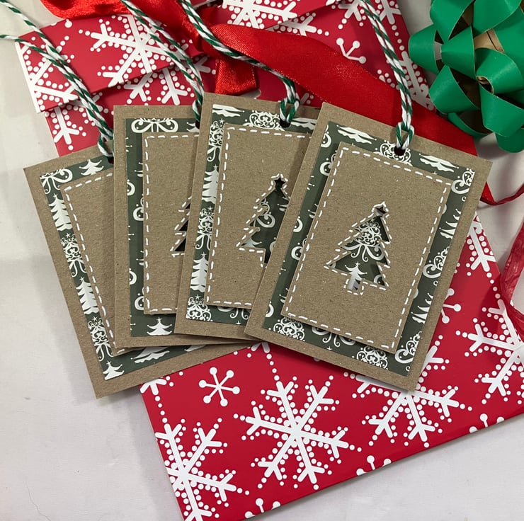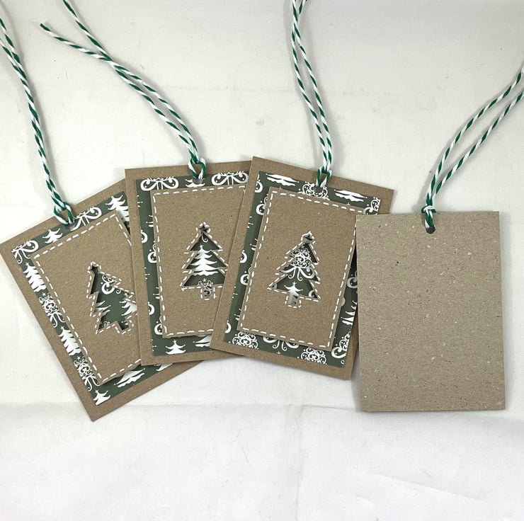 Pack of 4 Christmas gift tags, each with a Christmas tree shape cut from kraft card. The shape of the tree has been edged with hand drawn faux white stitching, along with the outer edges of the card. This topper has been overlaid onto a background of green and white Christmas tree patterned paper on a kraft tag, Each tag has a length of green and white baker's twine to attach it to your gift.