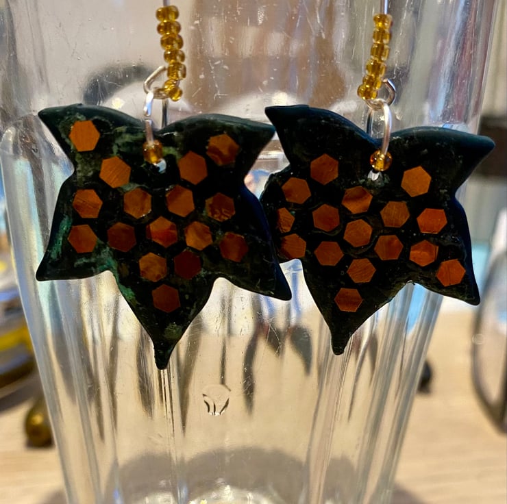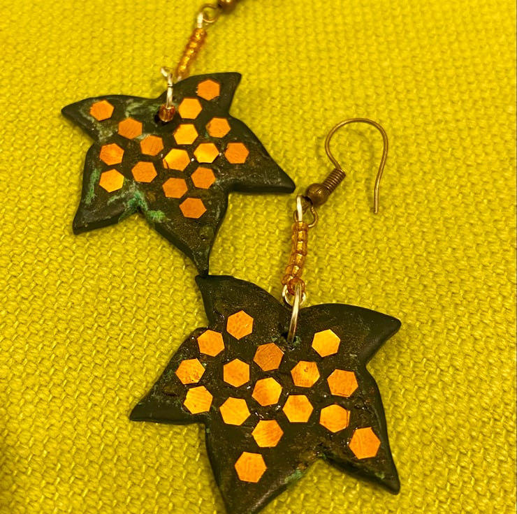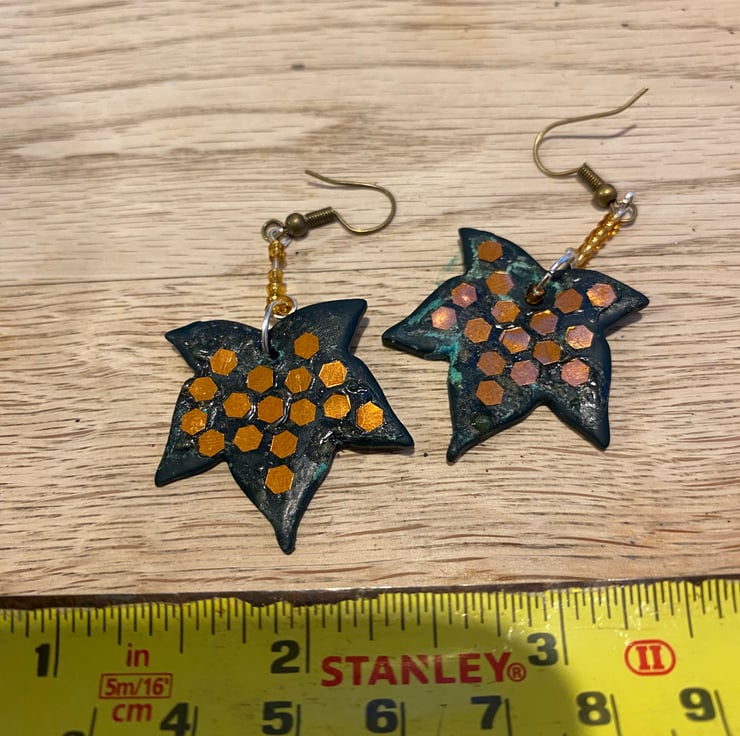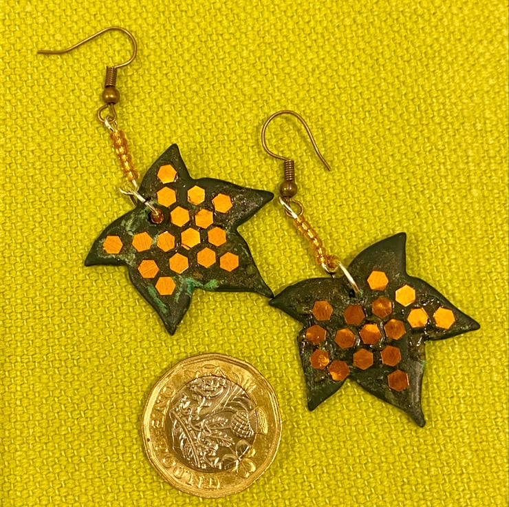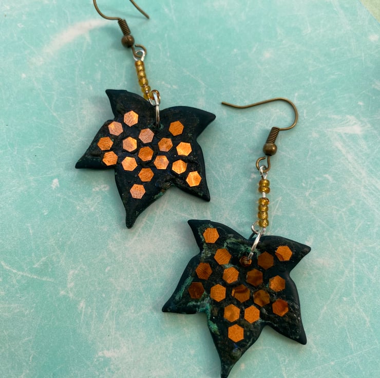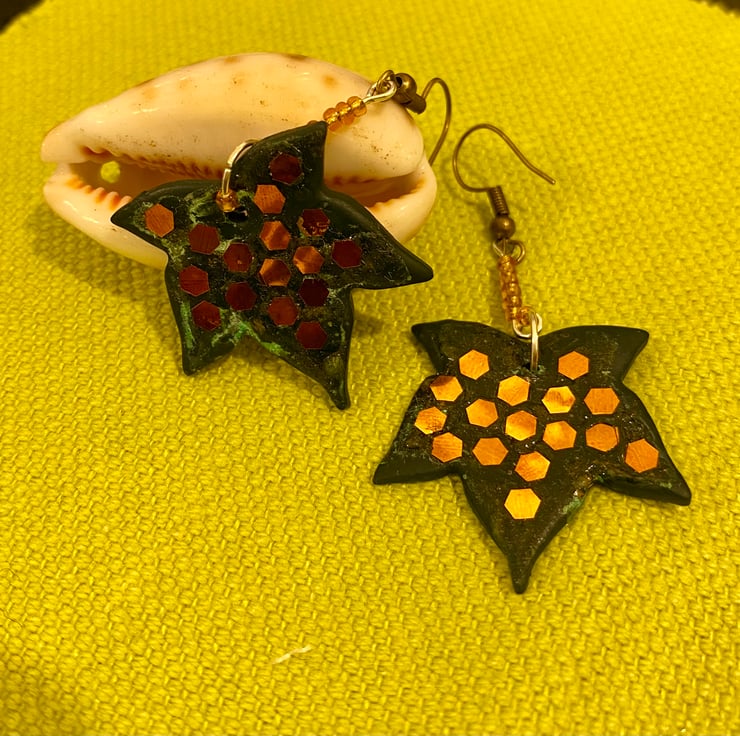 Each leaf measures 3cm x 3cm, featuring bronze embellishments and gold glass beads, which catch the light and sparkle.