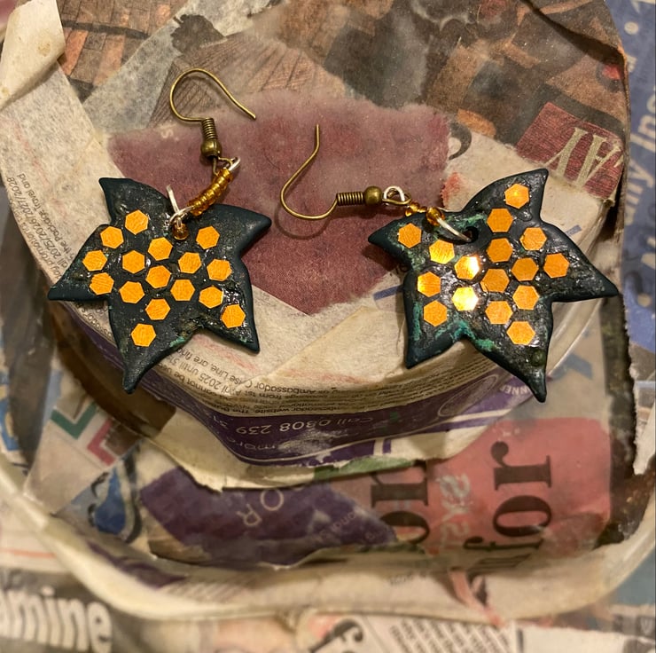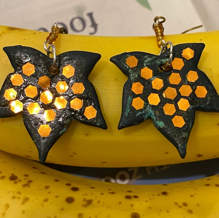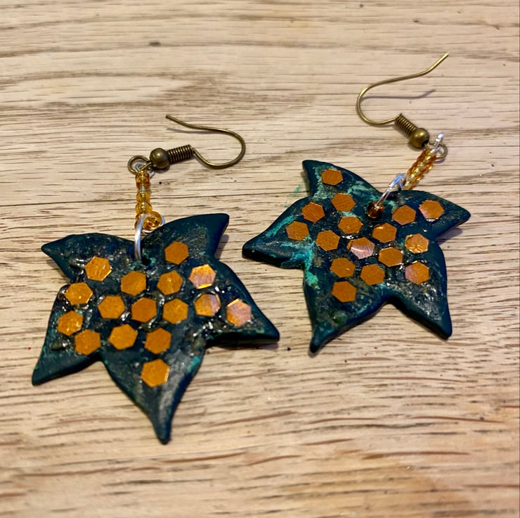 I’ve been playing around with polymer clay lately, and I love it! The colours are vibrant, it’s durable and lightweight enough to be comfortable to wear. I love the combination of green and gold on this pair.