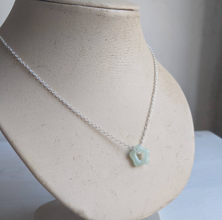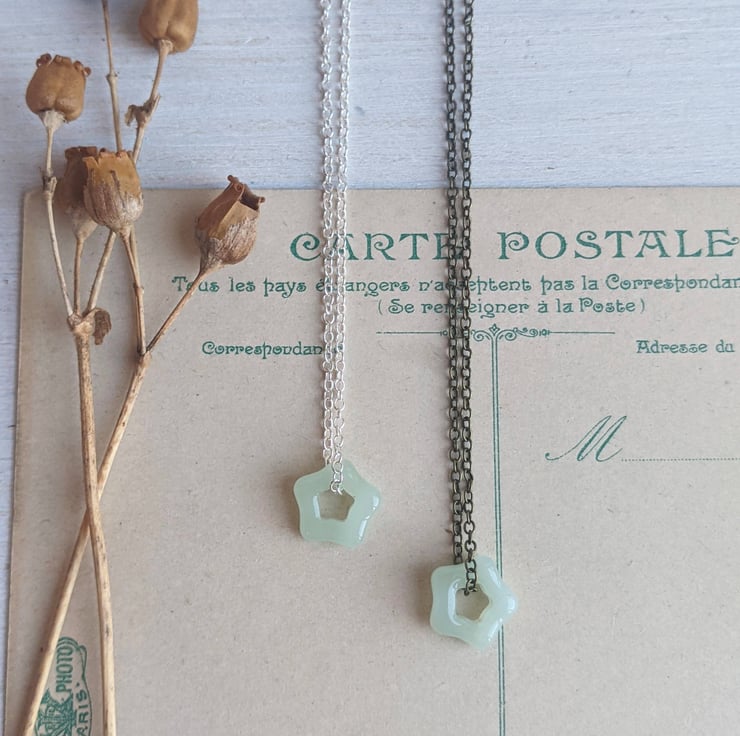 This beautiful green flower bead is threaded onto fine chain. Simple and beautiful.