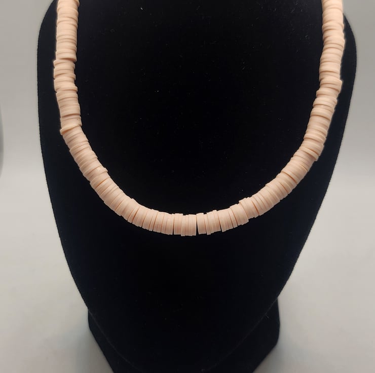 Colourful Orange and Cream Heishi Bead Necklace made clay beads with mean they are very lightweight and easy to wear. The necklace is finished with a silver plated clasp.