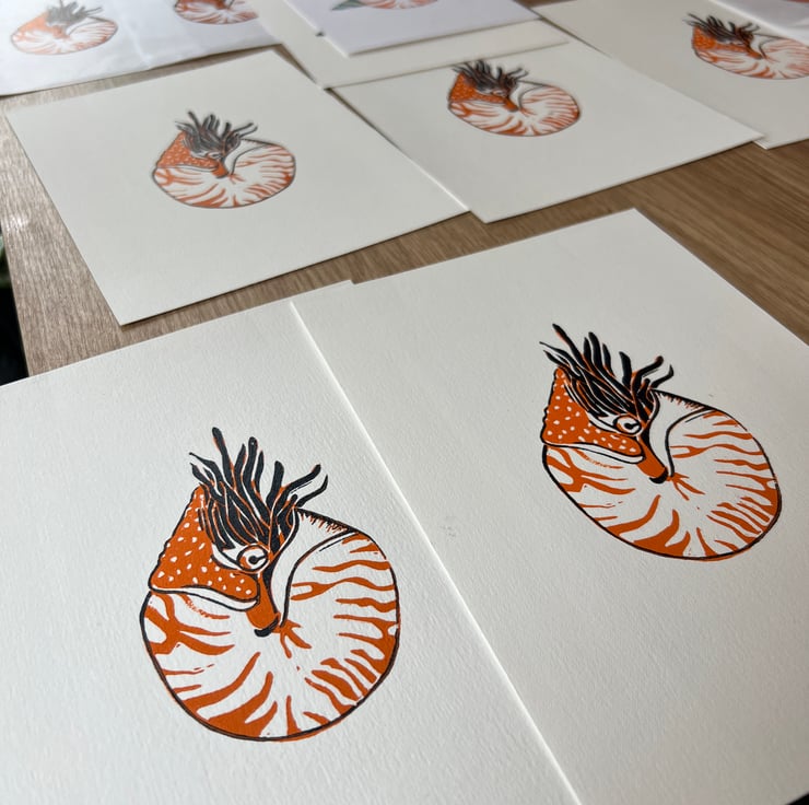 Handmade original lino print artwork of a single nautilus in vibrant orange and paynes grey.