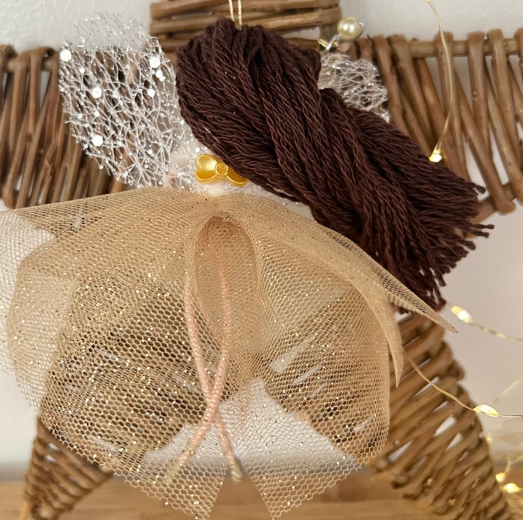 Woven and crafted with yarn, sequins, beads and care. The Christmas Gold Star fairy has a beautiful gold, glittery, layered skirt, a cream and gold bodice and delicate sparkly wings. She has a matching gold hair band and a Gold Star wand.