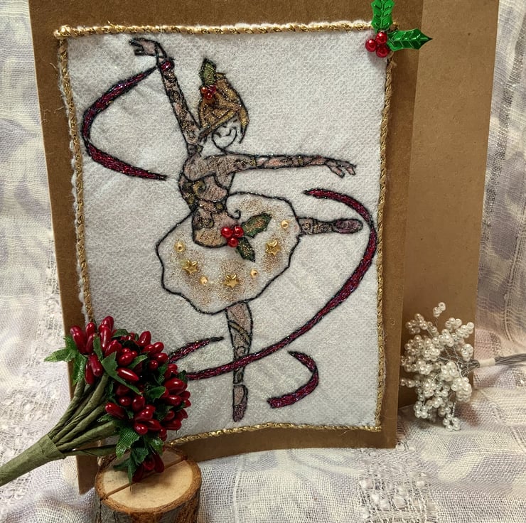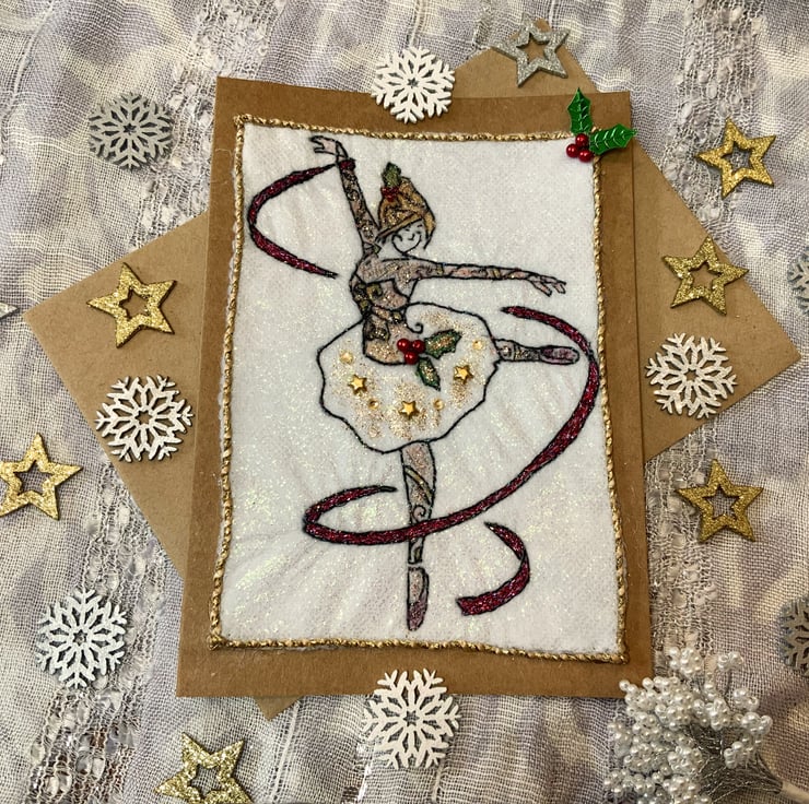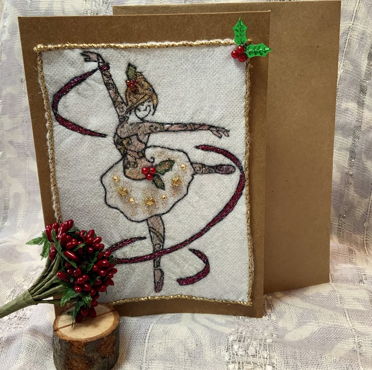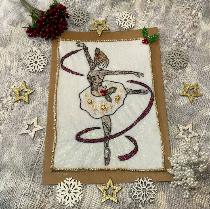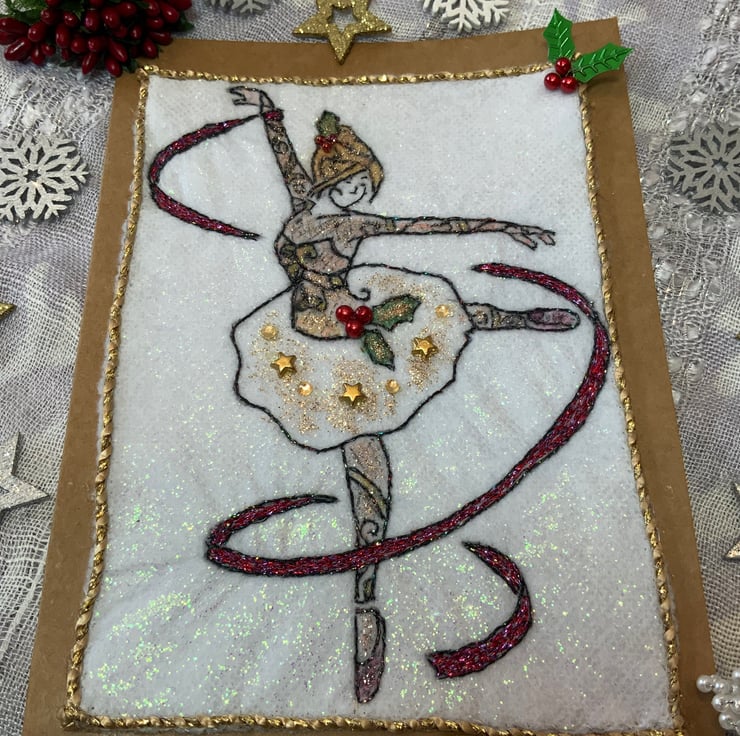 Lovingly hand embroidered and hand painted in watercolour on felt and fine embossed cotton with added sparkle. The ballet dancers dress is adorned with golden shimmer, added golden stars and diamonds with festive holly and berries. Her hair is also dressed with this festive