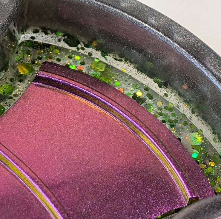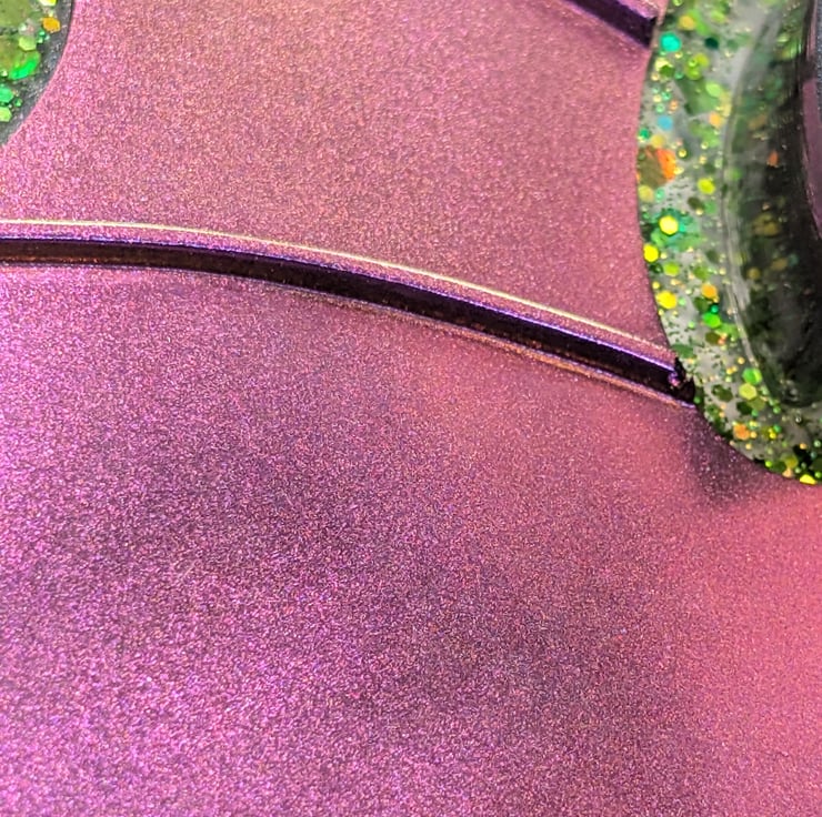 This striking resin bat tray combines deep, shifting tones with a sleek gunmetal rim for an elegant gothic finish. The base shifts between purple, teal, and orange as the light moves across it, creating an otherworldly glow that feels both mysterious and refined.