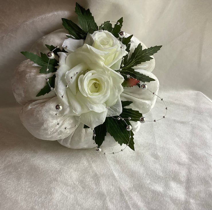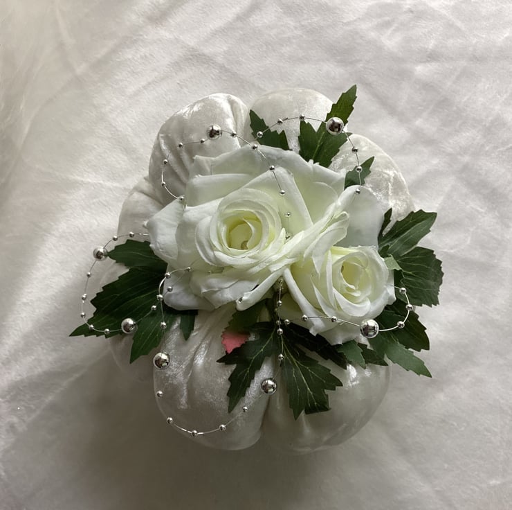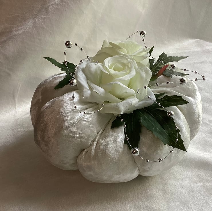 Handmade stuffed fabric pumpkin . Made from velvet white fabric ,embellish with leaves , rose . Approx diameter 57 cm.