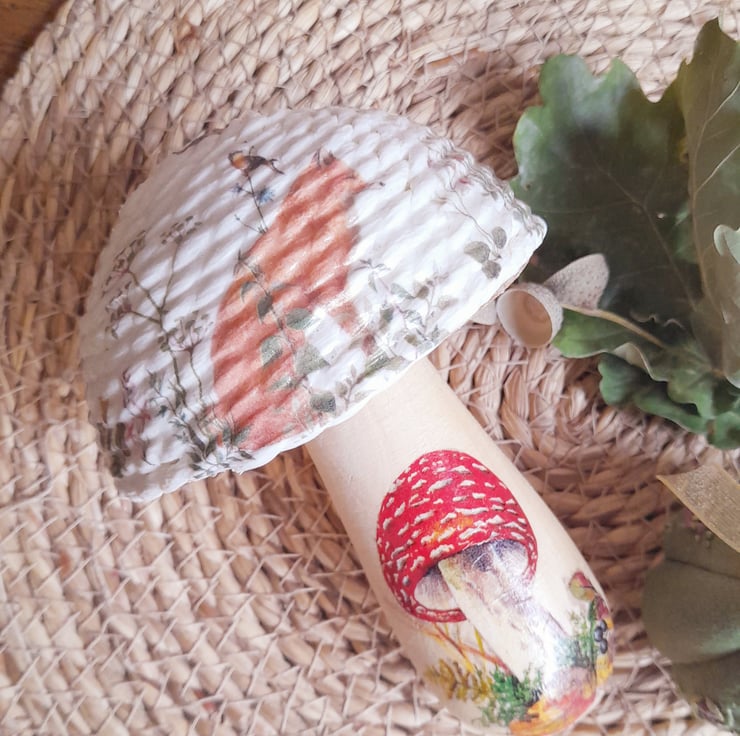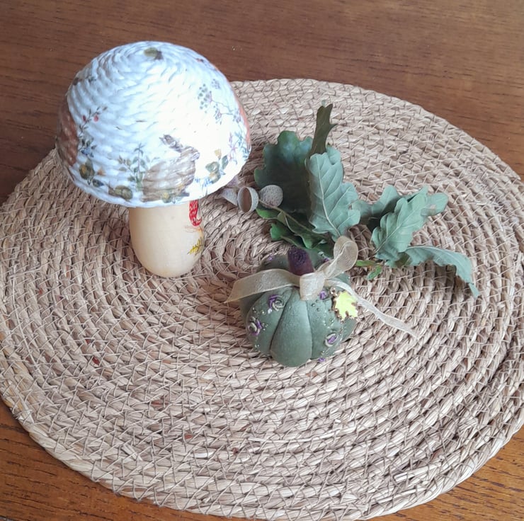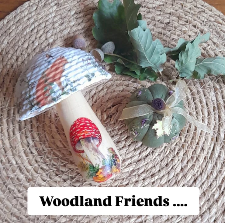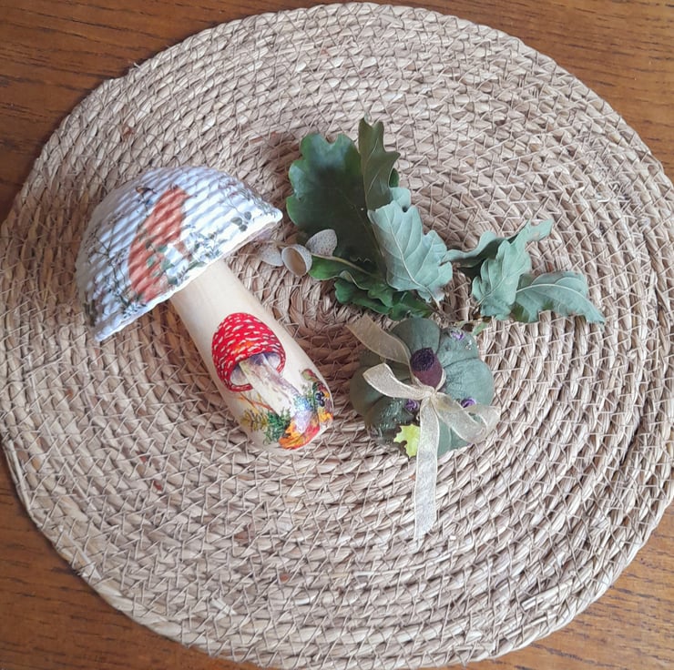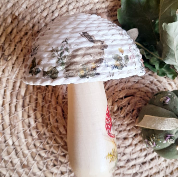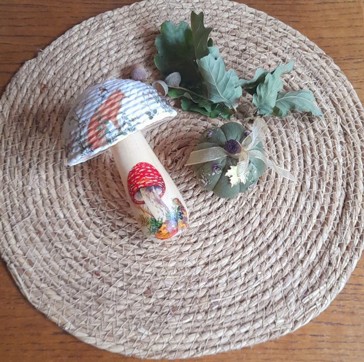 A gathering on the cap of the mushroom featuring a Fox, Hedgehog, Hare & Deer. The stem decorated with a toadstool & all varnished to protect.
