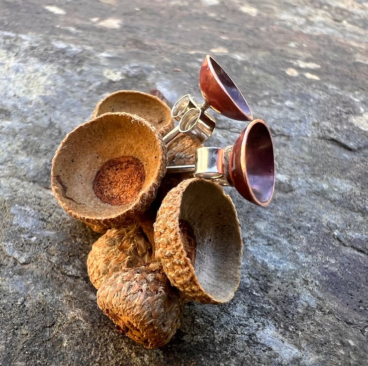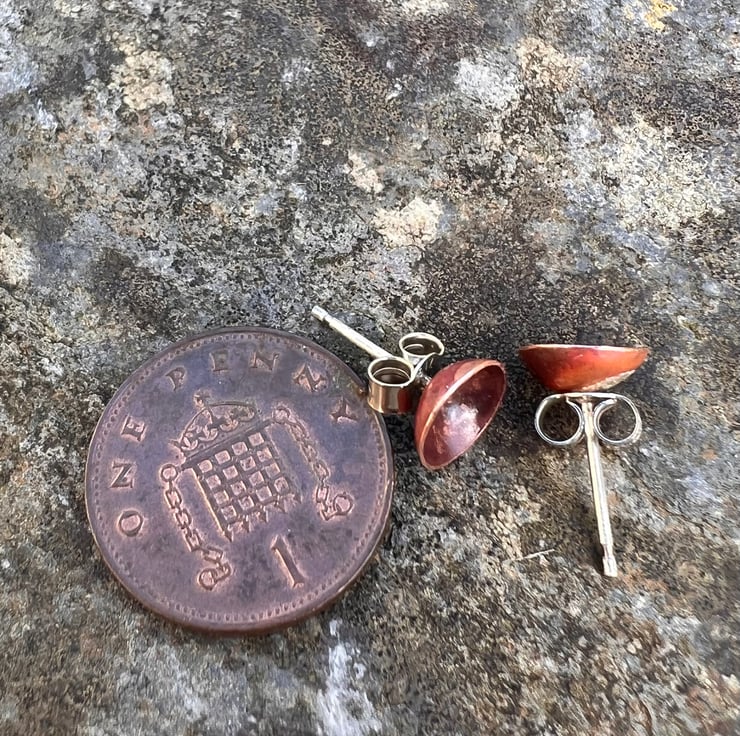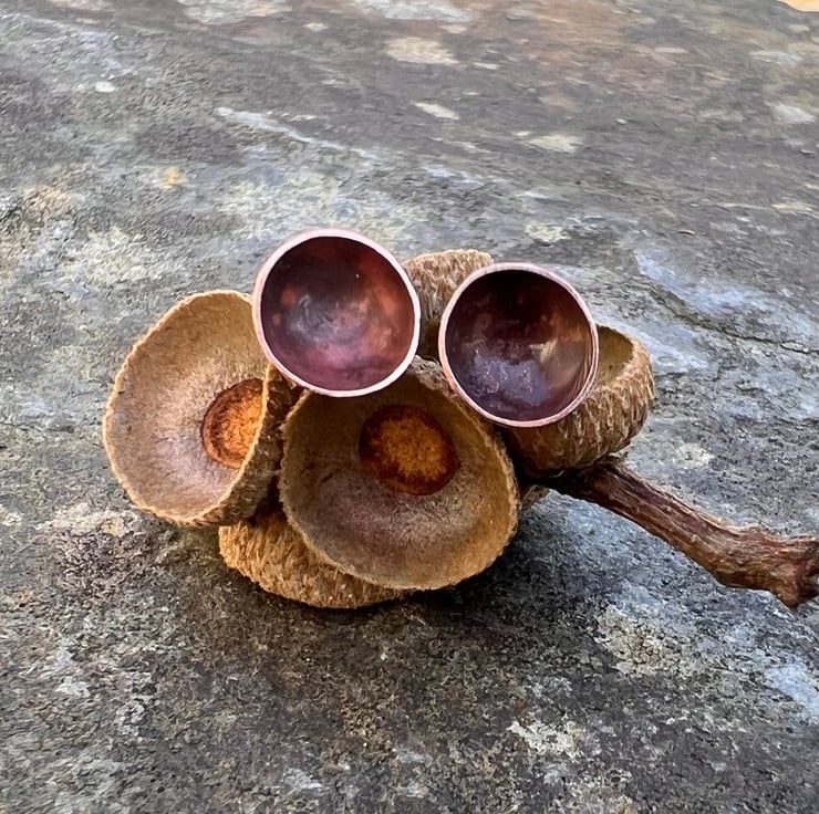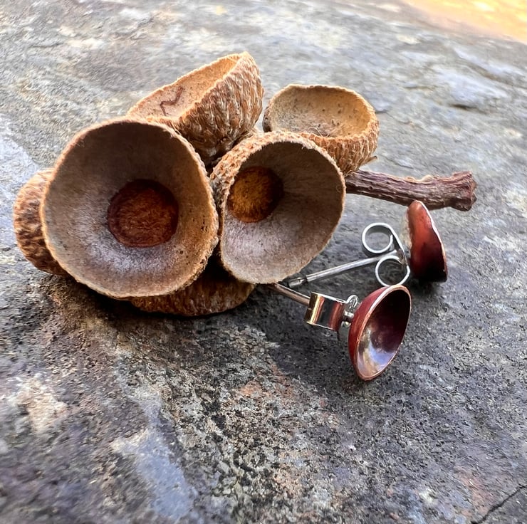 Copper acorn cup stud earrings . The deep red tones have been achieved using heat . This is an unpredictable but exciting process and gives unique results. The edges have been brought back to raw , shiny copper as a contrast to the deep red colours. The diameter of the earrings is 7.5mm and they sit neatly on the earlobe with a sterling silver earpost and scroll back .