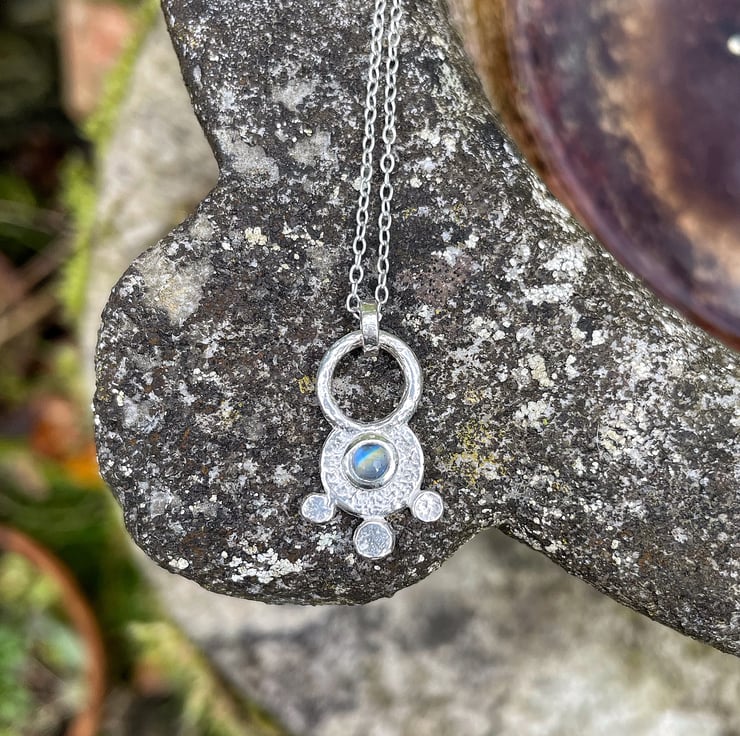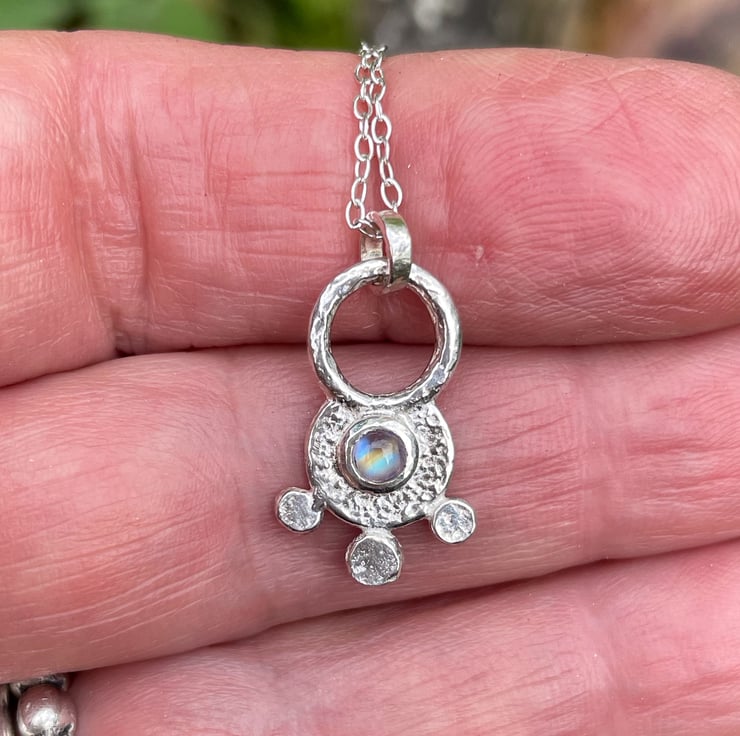 A fused, recycled silver pendant with a reticulated texture and a central set rainbow moonstone cabochon.