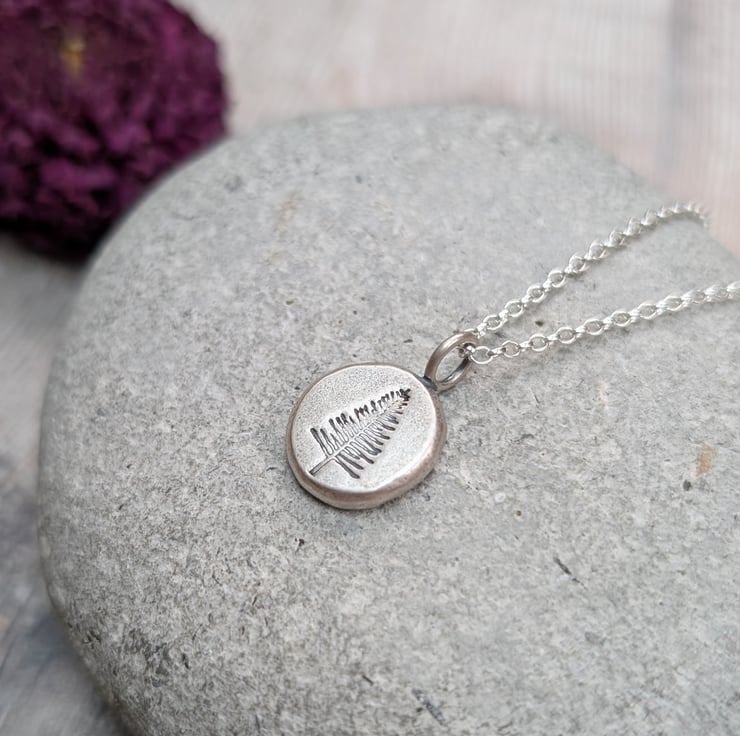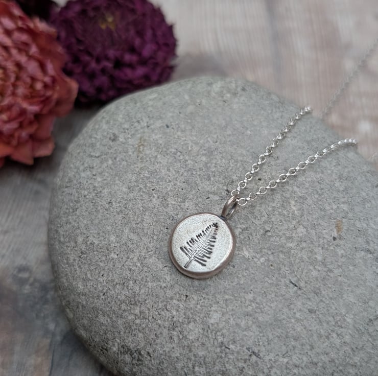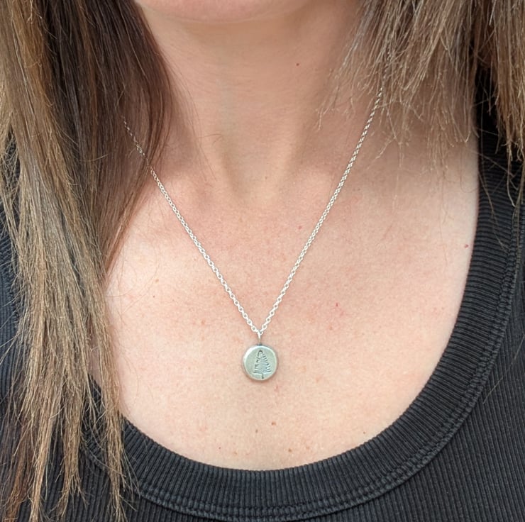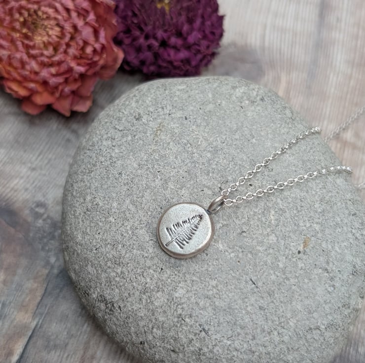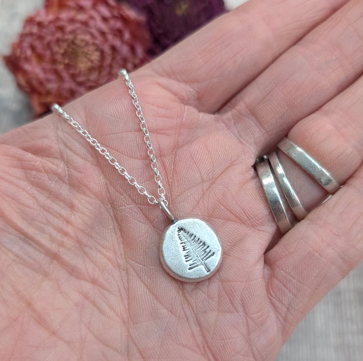 This silver evergreen tree pebble necklace features a small round pebble pendant, handmade from recycled sterling silver and imprinted with an evergreen tree design. The subtle matte finish gives it a soft, organic feel, and it hangs from a delicate silver chain. A lovely everyday piece symbolising strength and renewal, it makes a thoughtful gift for nature lovers.