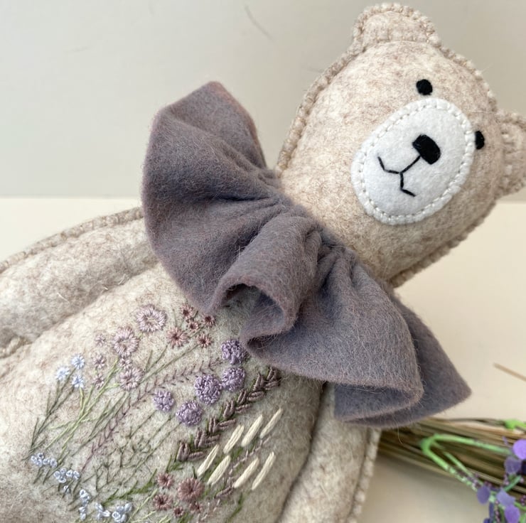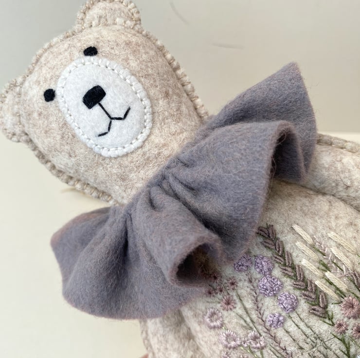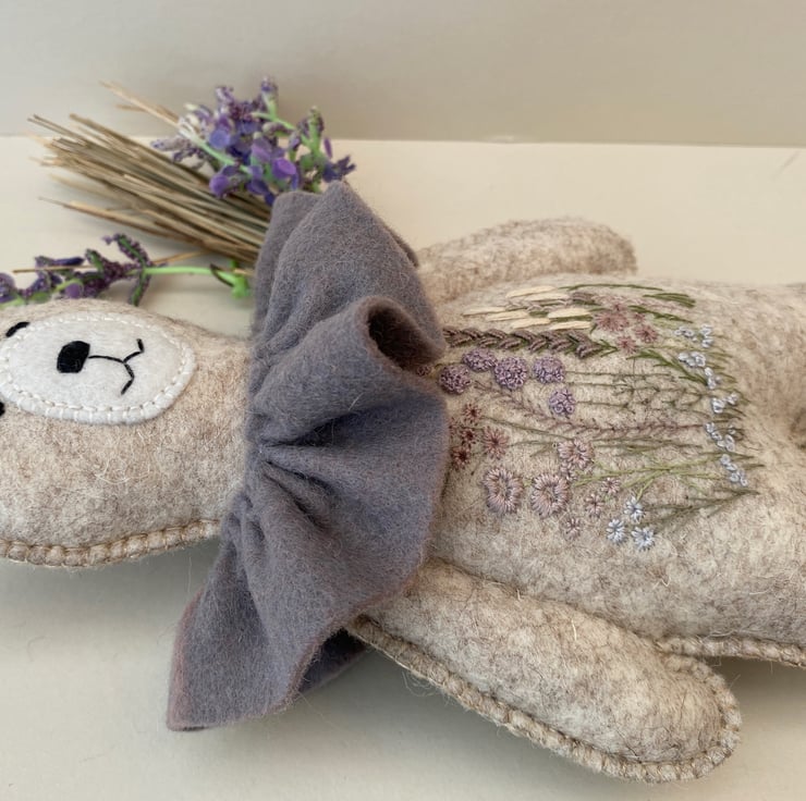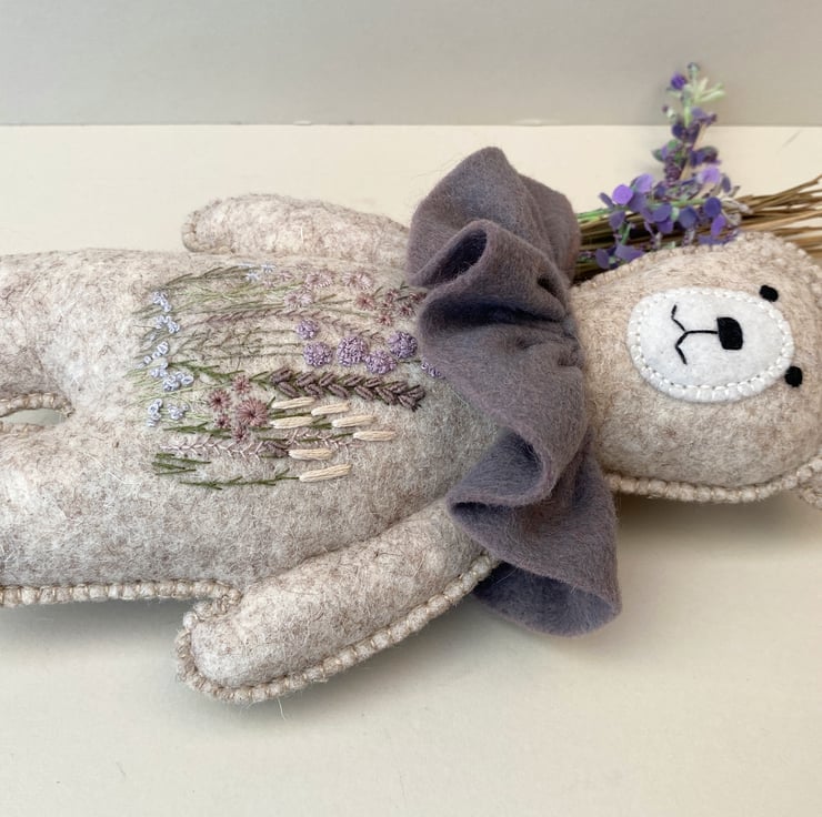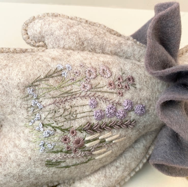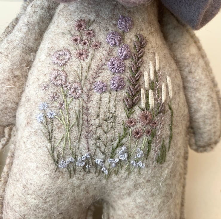 He has been hand sewn with triple seams for stability and decoration and has lovely hand embroidered flowers to his middle in pale plums and greens with hints of lilacs and grey.