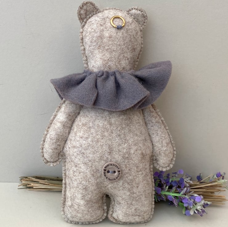 A little woodland bear approx 8" tall designed as a decorative item to stand (when propped) or to be hung on a wall from a little brass ring to the back of his head.