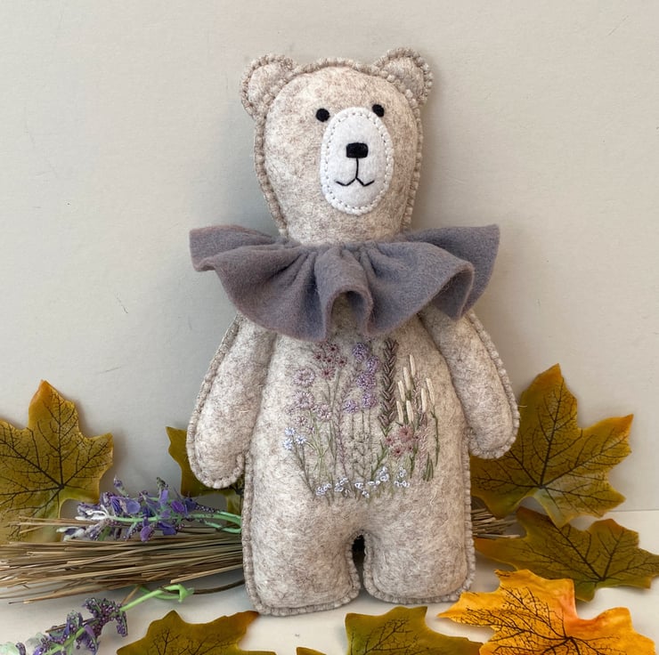 Woodland teddy bear to stand or hang on a wall, hand sewn and embroidered collectable.