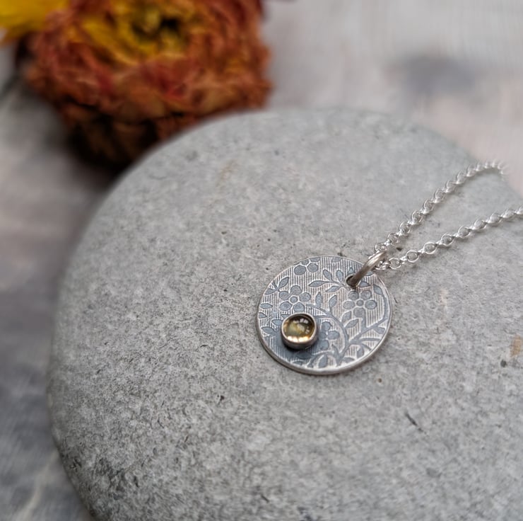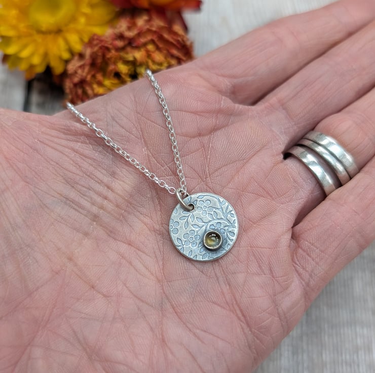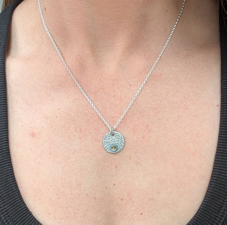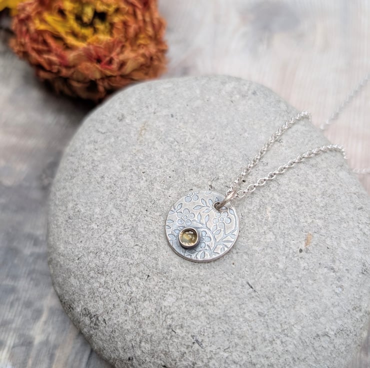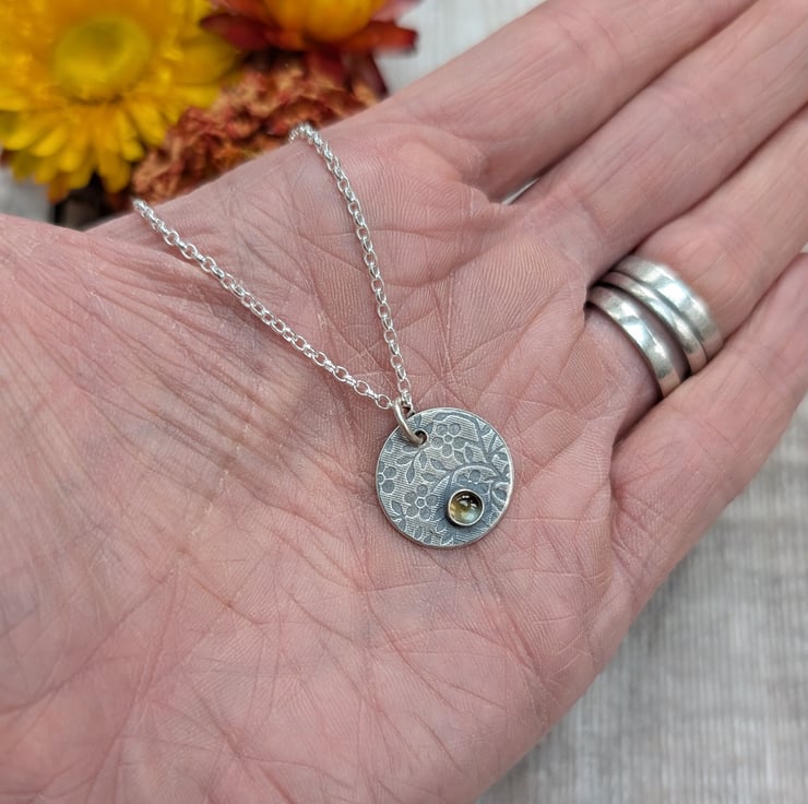 This silver flower disc necklace with citrine features a patterned silver disc with a warm golden citrine gemstone set near the base. Handmade from recycled sterling silver, the pendant is decorated with a delicate floral design that adds subtle texture and charm. The hint of golden colour from the citrine catches the light beautifully, making it a lovely everyday piece or a thoughtful gift for someone special.