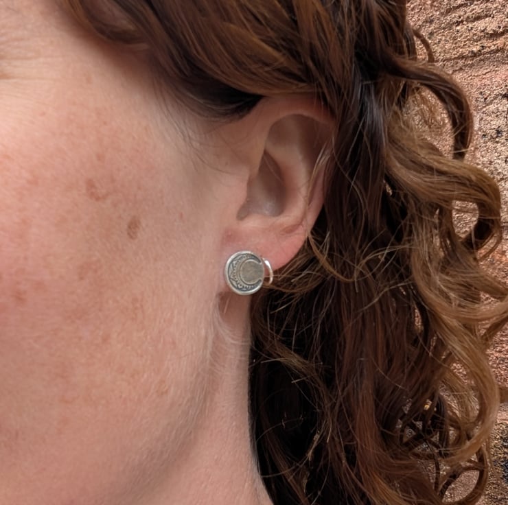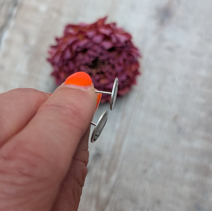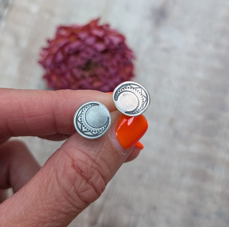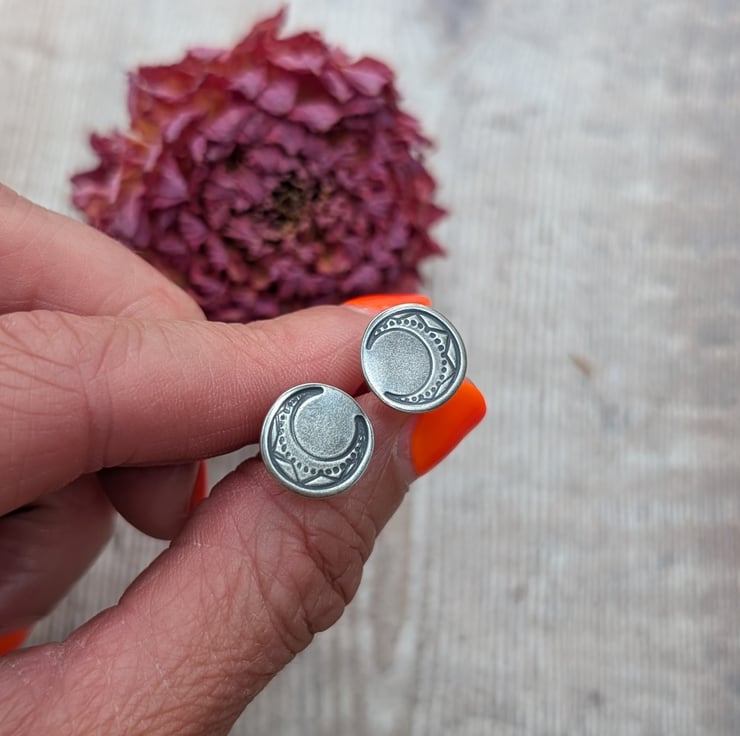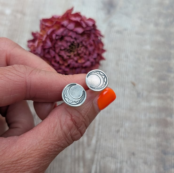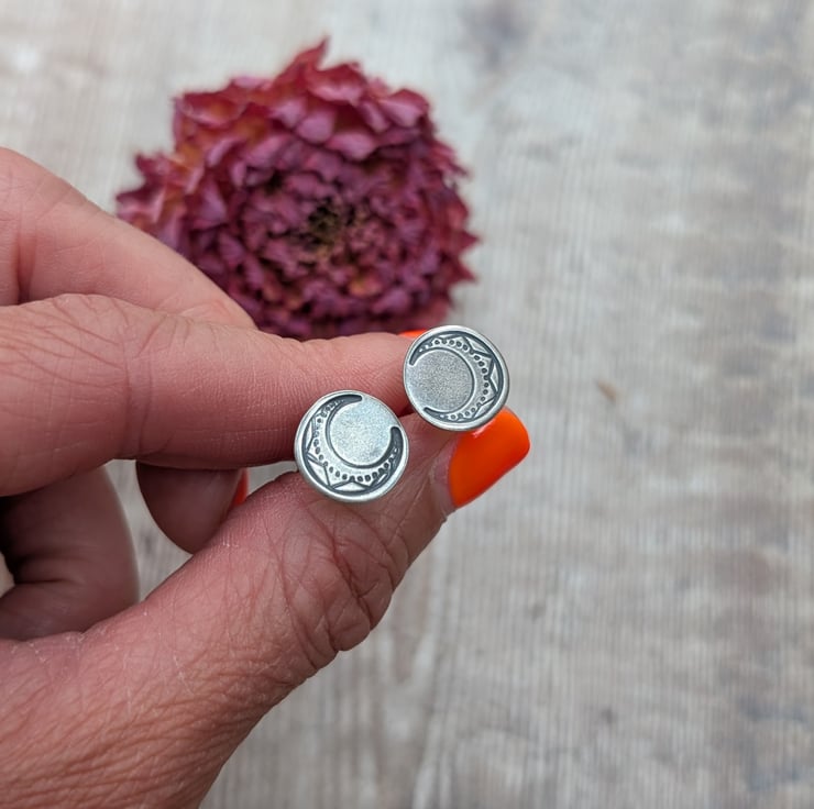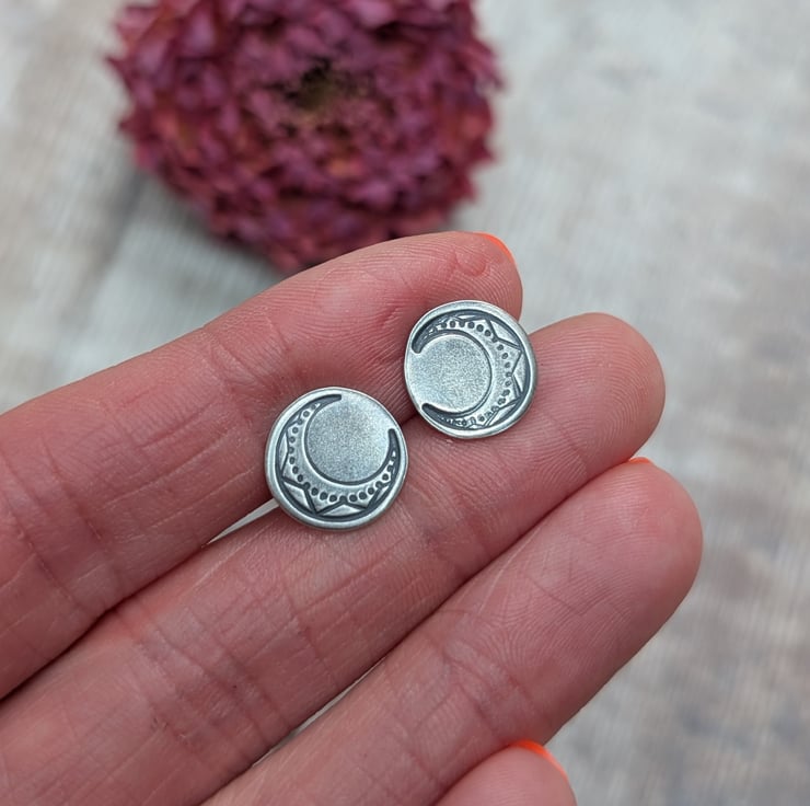 These handmade silver large moon disc stud earrings feature a hand stamped crescent moon design with subtle oxidised detailing that highlights the pattern beautifully. The round discs are slightly domed, giving them a comfortable fit and a timeless look that suits everyday wear. Made from recycled sterling silver, these moon-inspired studs make a lovely gift for anyone who loves celestial jewellery or meaningful, handmade pieces.