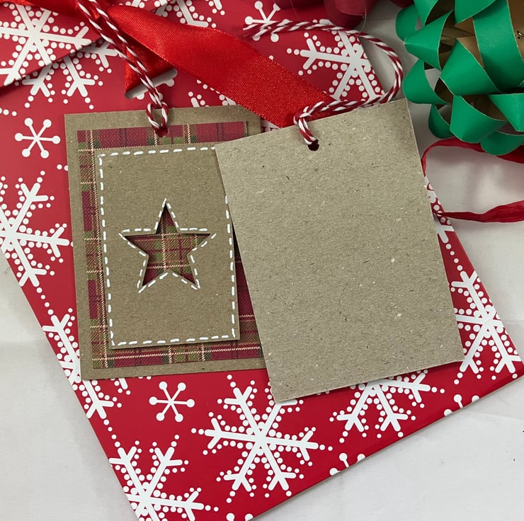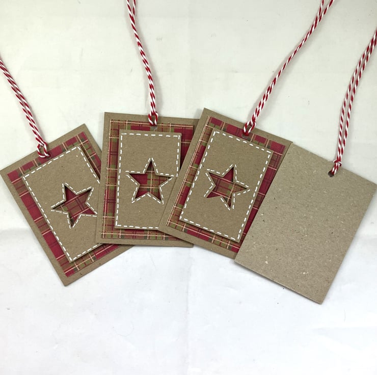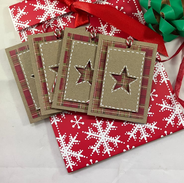 Pack of 4 Christmas gift tags, each with a star cut from kraft card. The star and the outer edge of the card have been given hand drawn faux stitching in white ink. This topper has been overlaid onto a background of red and gold tartan patterned paper on a kraft tag, Each tag has a length of red and white baker's twine to attach it to your gift.