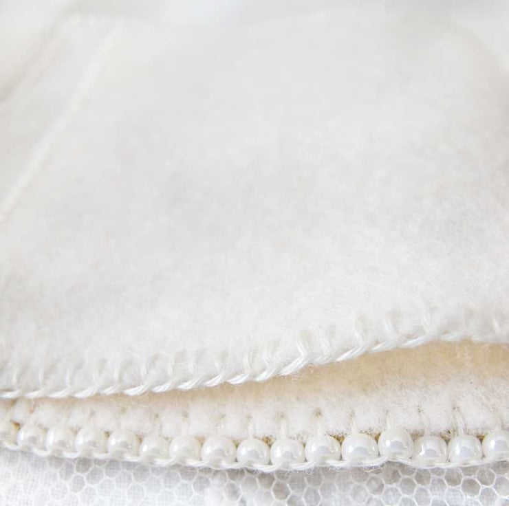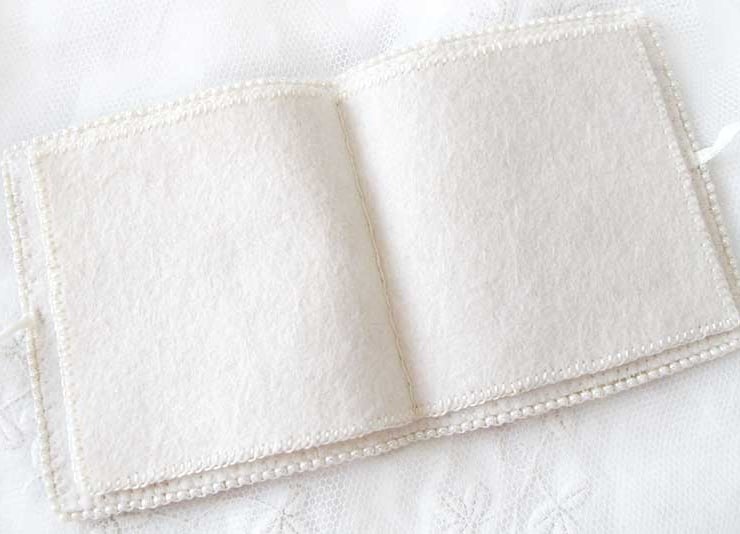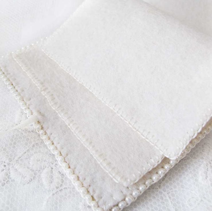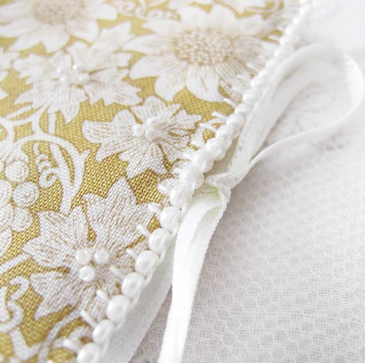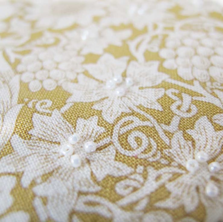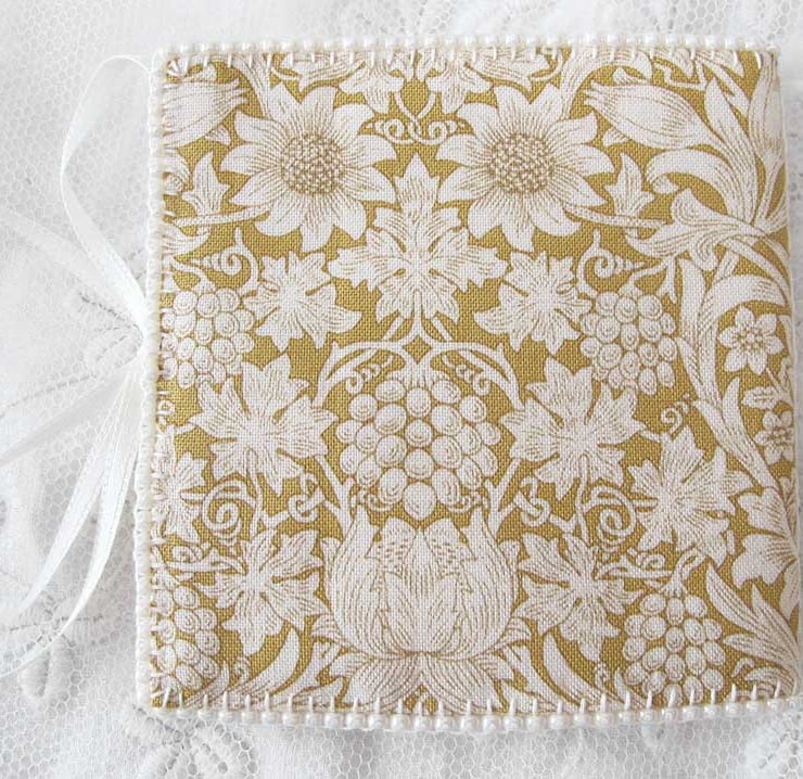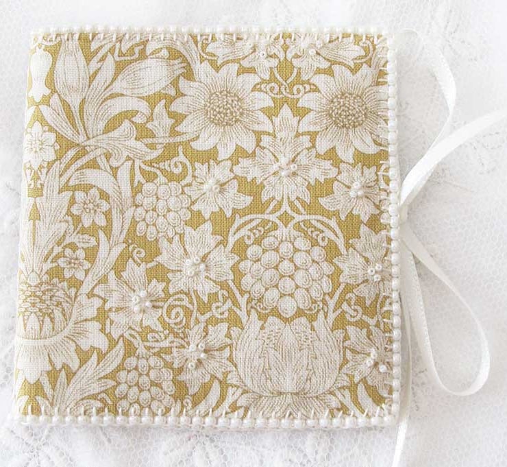 A very pretty little needle book in a soft golden yellow and cream William Morris design fabric.. Cream felt is used for the pages and also to line the book. The edges of the book have been hand-beaded with small glass seed beads in a creamy off-white pearl effect, and little groups of smaller pearly beads have been added randomly to the front of the book for decoration. The felt pages have been edged with hand stitiching and off-white satin ribbons are used to keep it closed with a bow. This would make a lovely gift for a sewing enthusiast or even add a little touch of 'pretty' to your own needlework basket!