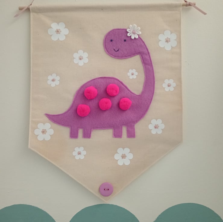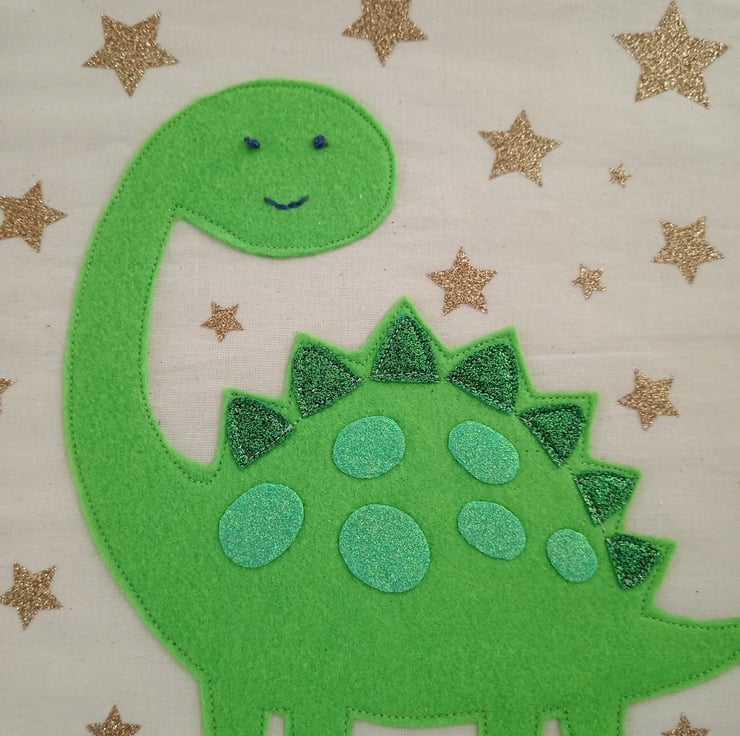 Dinosaur fabric Wall Hanging handmade from canvas, felt and glitter vinyl stars. Can be personalised.