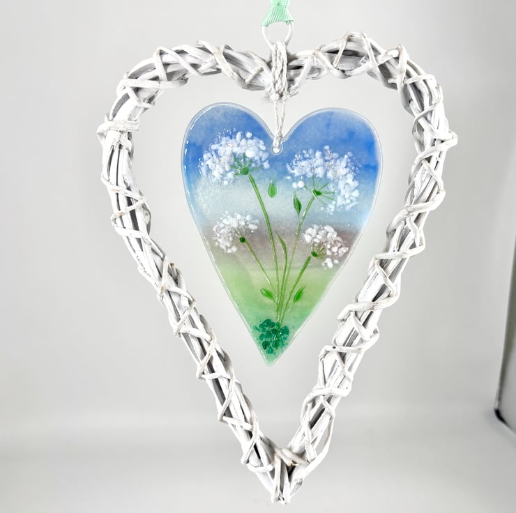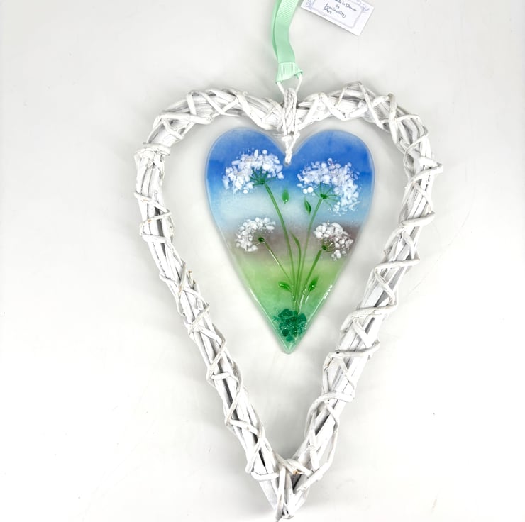 The glass is suspended in the middle of a white wicker heart and piece has been finished with a length of co-ordinating ribbon.