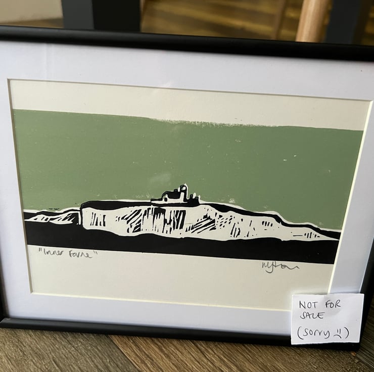 Original handmade multi block lino print of Inner Farne off the Northumberland coast with sage green sky. Made with a hand printing press using oil based Cranfield inks on quality relief printing paper.