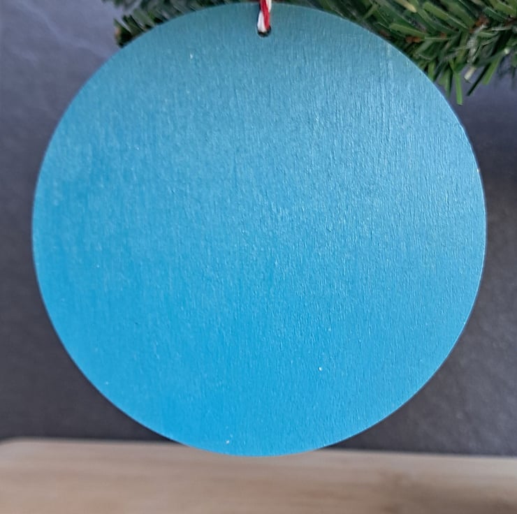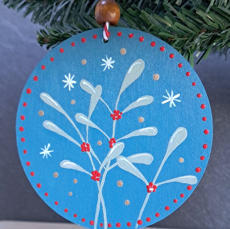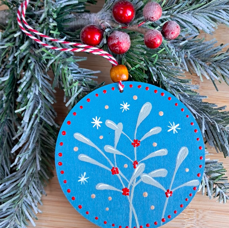This beautiful round wooden ornament features delicate mistletoe branches hand-painted in soft green, accented with vibrant red berries and whimsical snowflakes. Set against a rich blue background and bordered with cheerful red dots, this festive piece is perfect for adding rustic, cosy vibes to your Christmas tree.