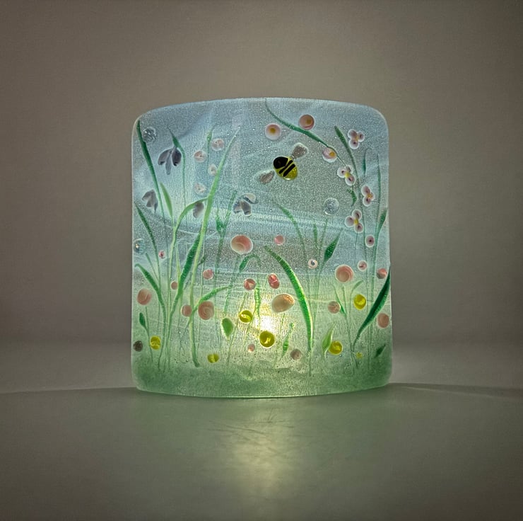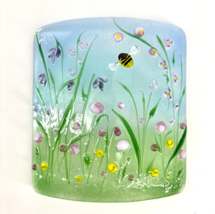 A pretty, free standing glass curve with a delicate flower meadow in pastel shades with a little bee.