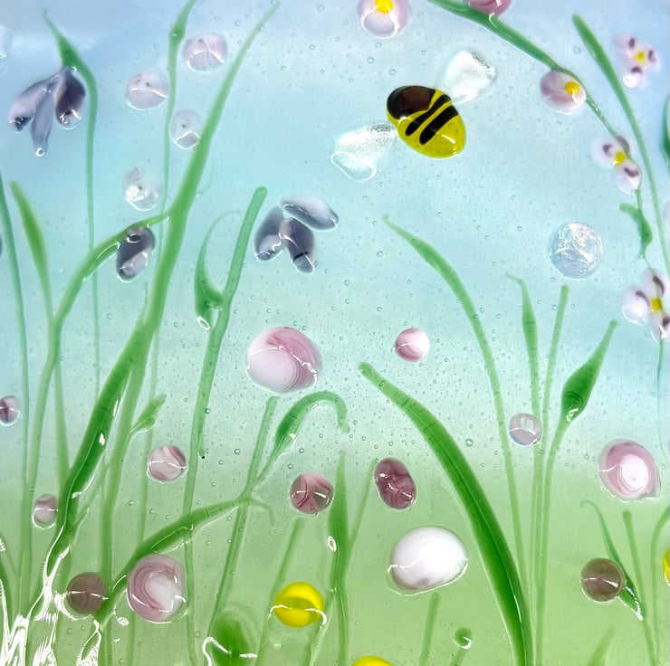 I've always been a stickler for detail which isn't always easy to achieve with fused glass. After many hours of 'playing' I created my meadows which are made up of tiny lamp worked flowers and foliage with gorgeous accents of sparkle from dichroic glass. The result is ethereal - delicate, feminine and quite positively dreamy!