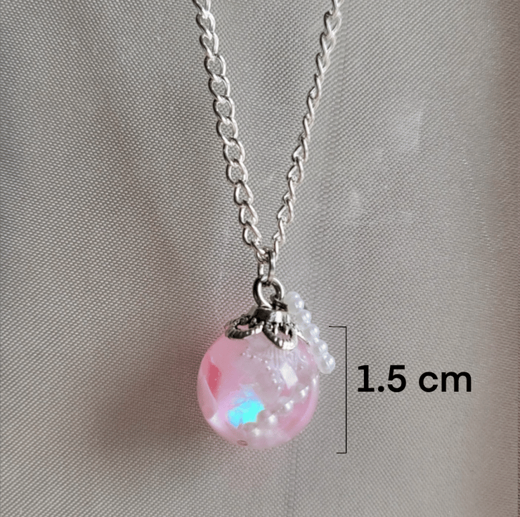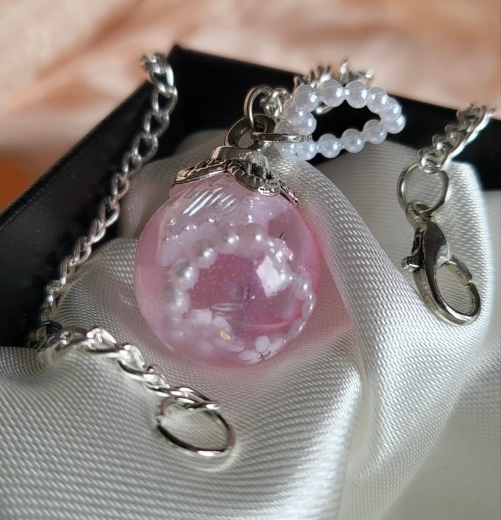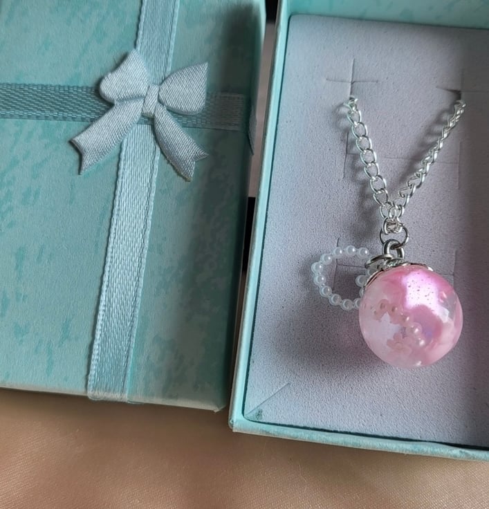 This cute pink ball necklace is a perfect gift for anyone who loves pink and/or cute things. Its filled with white and pink hearts, bows, flowers and stars making it perfect for kawaii fashion lovers.