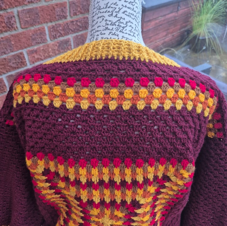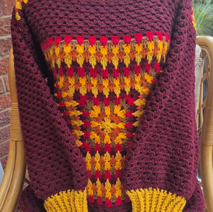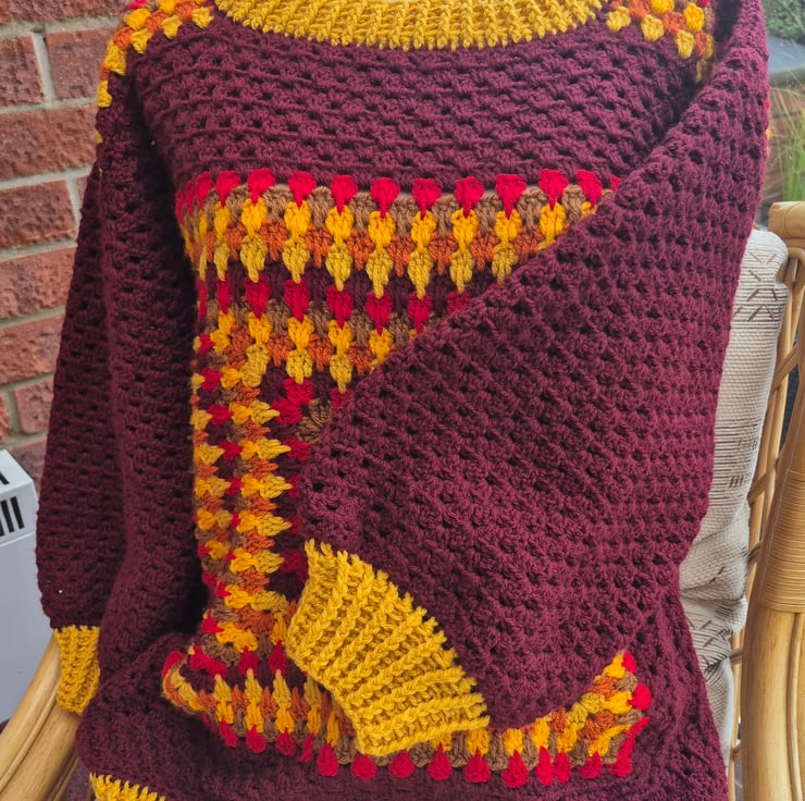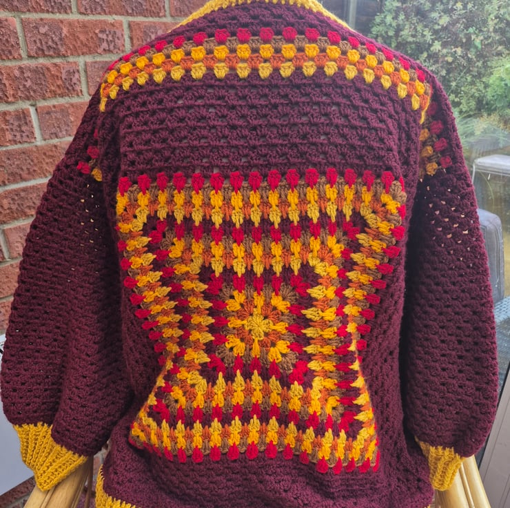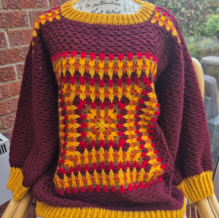 This handmade crochet jumper features an unusual Granny Square design on the front and back, perfect for a casual occasion. The acrylic yarn is machine washable at 30°.The jumper has a round neckline and long sleeves, making it super cosy and with the glorious colours of Autumn it will be a great addition to your Autumn /Winter wardrobe.