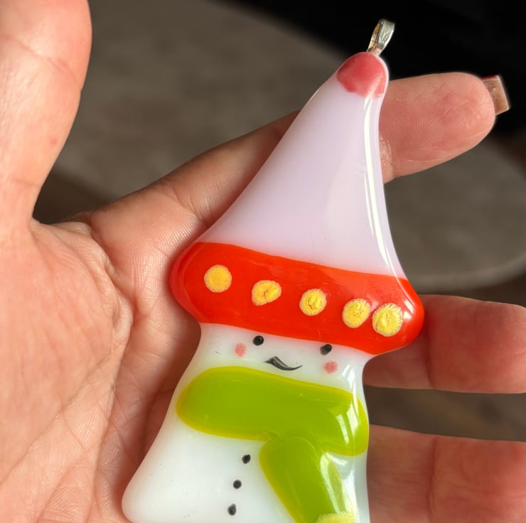 This handmade snowman Christmas tree decoration has been made using fused glass art. It is a slightly unhappy snowman who needs a new loving home. Please take pity on him and help to re home him, either on your tree or as a gift.