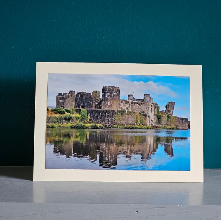 A quality photo card featuring Caerphilly Castle in South Wales. Did you know it is the largest castle in Wales! This photo was taken on a beautiful day at the end of August. I particularly like the reflection in of the castle in the water. This beautiful medieval fortress is surrounded by artificial lakes.