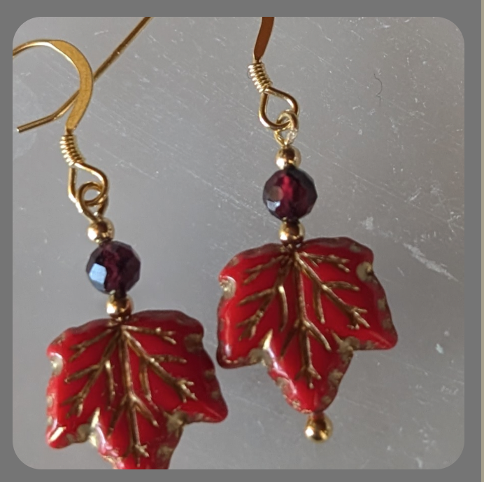Red Czech Glass Leaf, Garnet and Vermeil (gold plated sterling silver) Earrings.