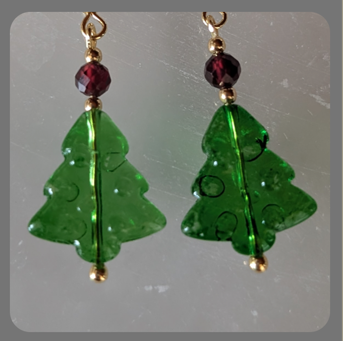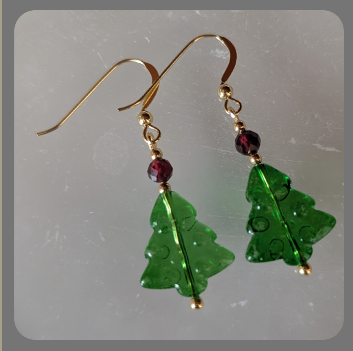 Cute Glass Christmas Tree, Garnet and Vermeil (gold plated sterling silver) Earrings.